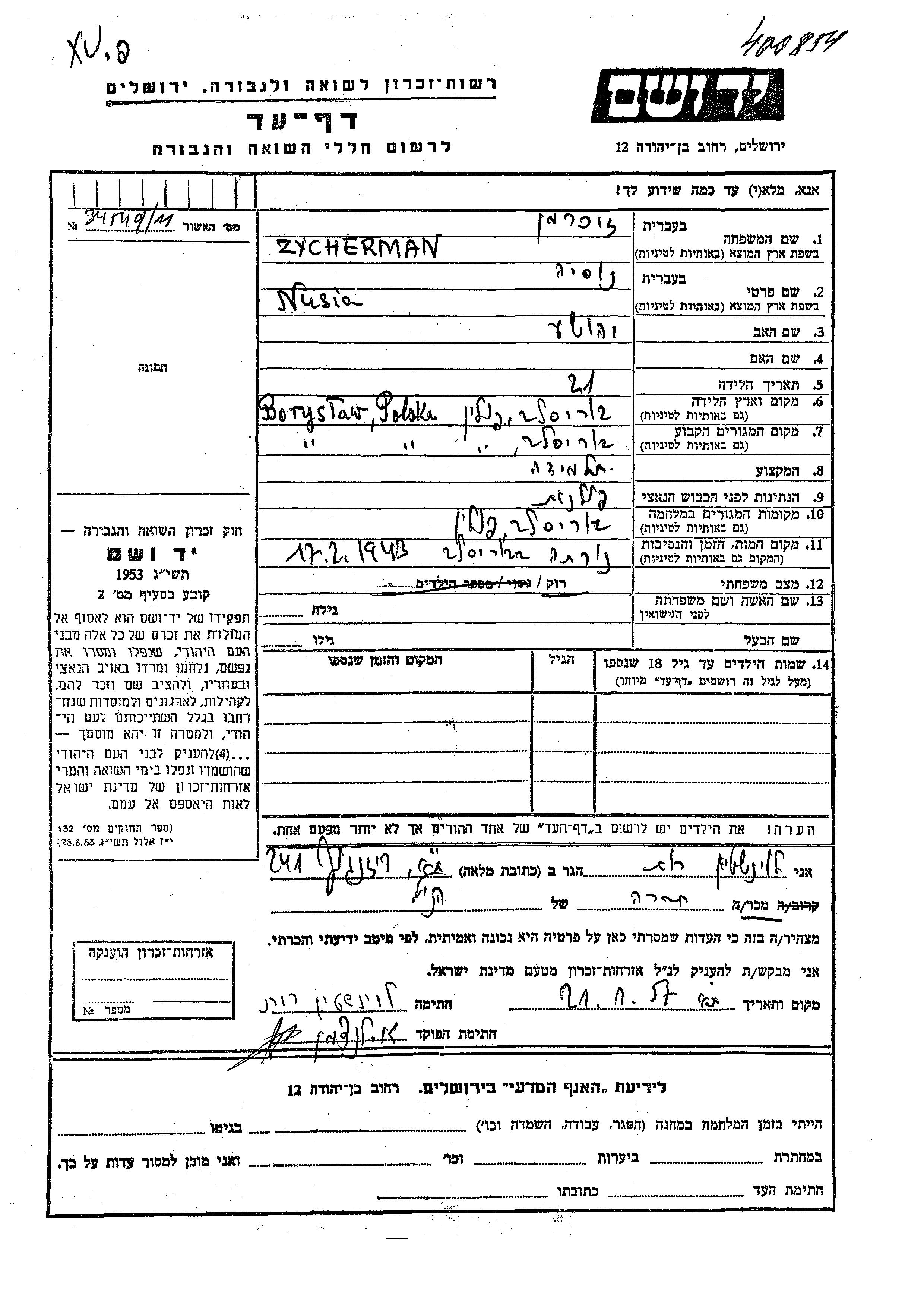 Nusia Nushia Zycherman wurde in Boryslaw, Polen geboren. Sie war die Tochter von Yehoshua. Sie war Schüler/-in und Ledig. Vor dem Zweiten Weltkrieg lebte sie in Boryslaw, Polen. Während des Krieges war sie in Boryslaw, Polen.