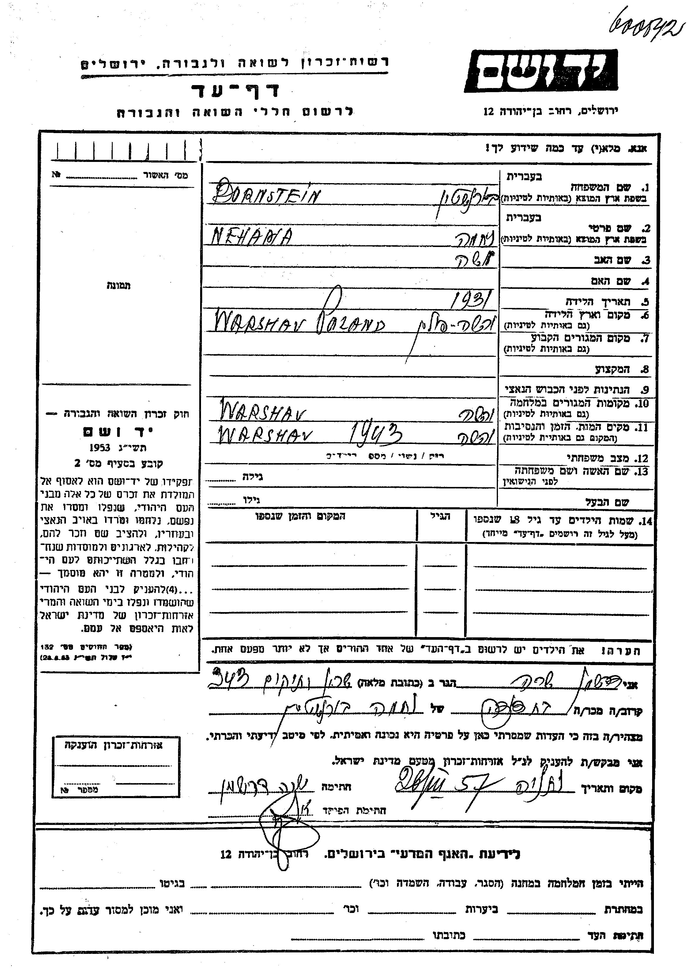 Nehama Bornstein wurde im Jahr 1931 in Warszawa, Polen geboren. Sie war die Tochter von Moshe. Während des Krieges war sie in Warszawa, Polen.
