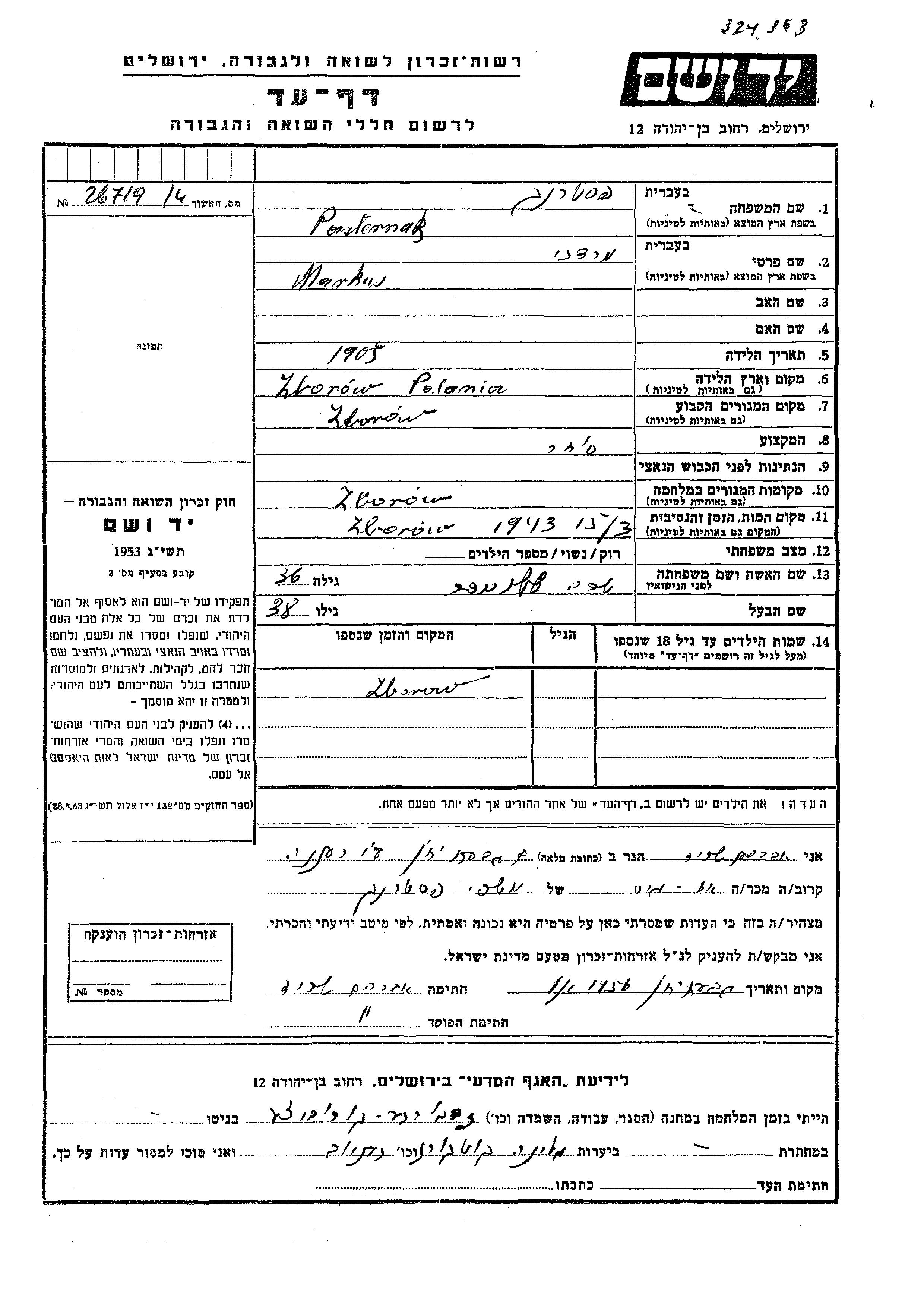 Mordekhai Markus Pasternak wurde im Jahr 1905 in Zborow, Polen geboren. Er war Kaufmann/-frau und mit Sara, geb. Shlomper Verheiratet. Vor dem Zweiten Weltkrieg lebte er in Zborow, Polen. Während des Krieges war er in Zborow, Polen.
