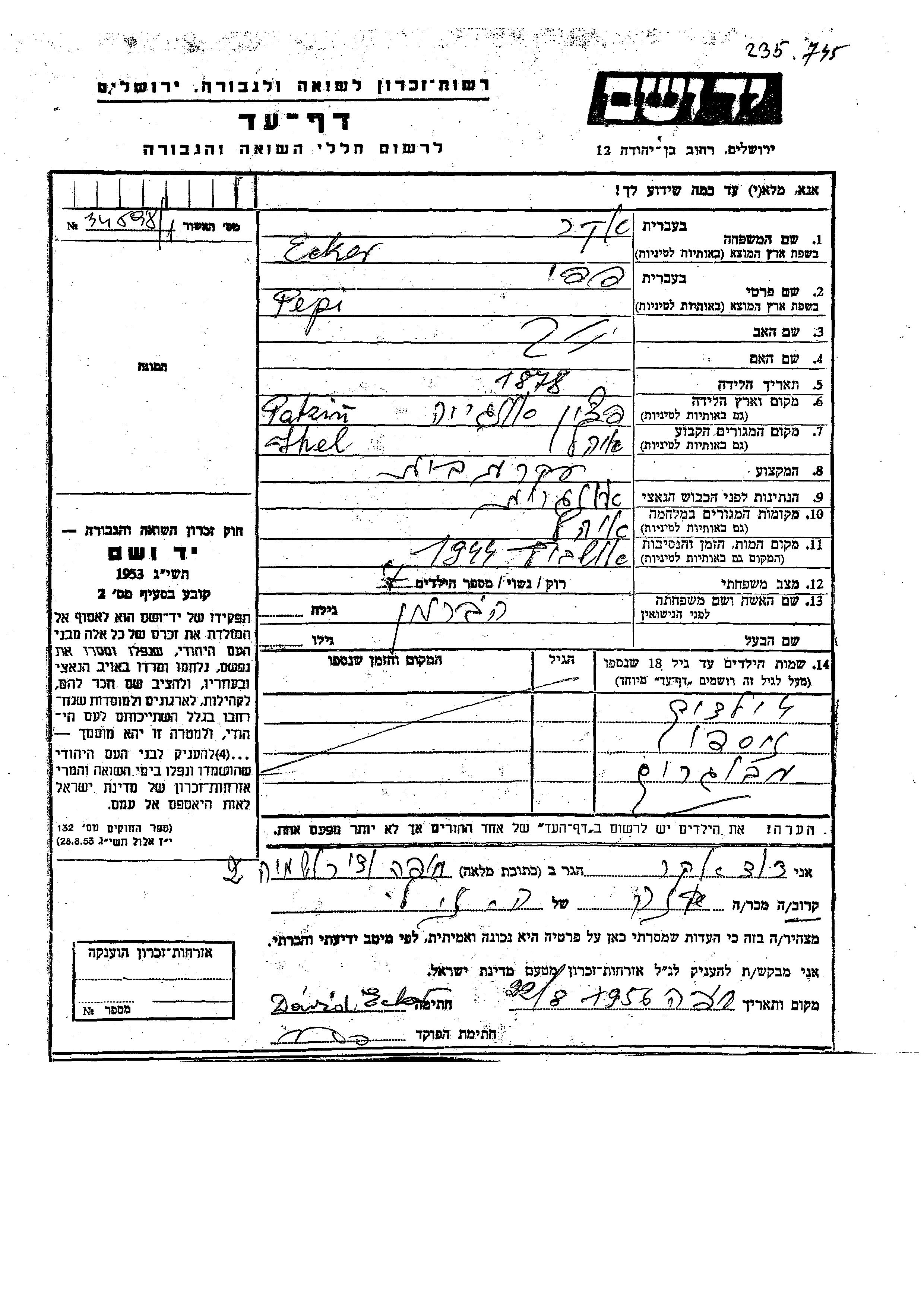 Pepi Ecker Aker, geb. Haberman wurde im Jahr 1878 in Paczin, Ungarn geboren. Sie war Hausfrau und Verheiratet. Vor dem Zweiten Weltkrieg lebte sie in Ujhely, Tschechoslowakei. Während des Krieges war sie in Ujhely, Tschechoslowakei.