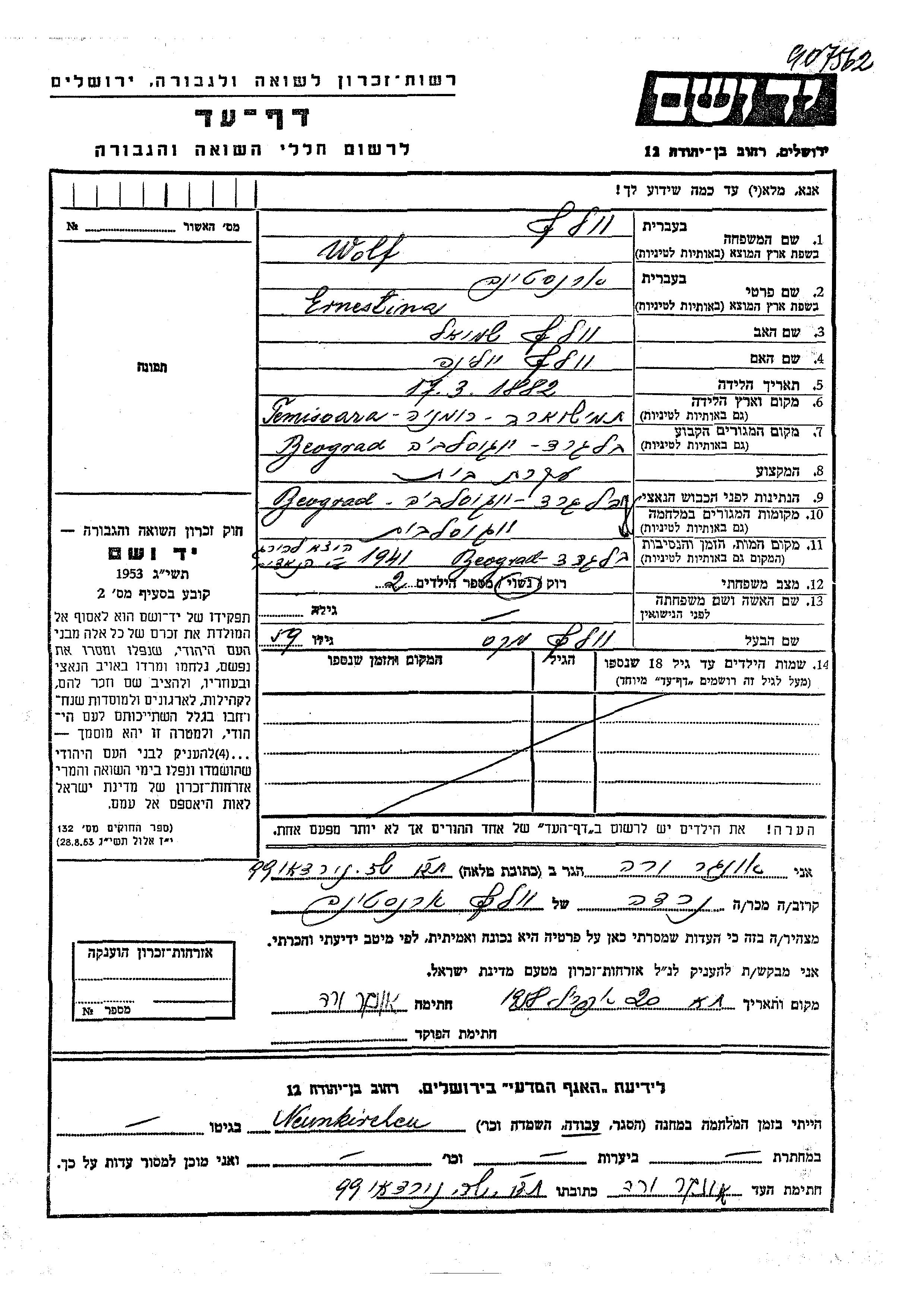 Ernestina Wolf wurde im Jahr 1882 in Timisoara, Rumänien geboren. Sie war die Tochter von Shmuel und Iulina. Sie war Hausfrau und mit Max Verheiratet. Vor dem Zweiten Weltkrieg lebte sie in Belgrad, Jugoslawien. Während des Krieges war sie in Jugoslawien.