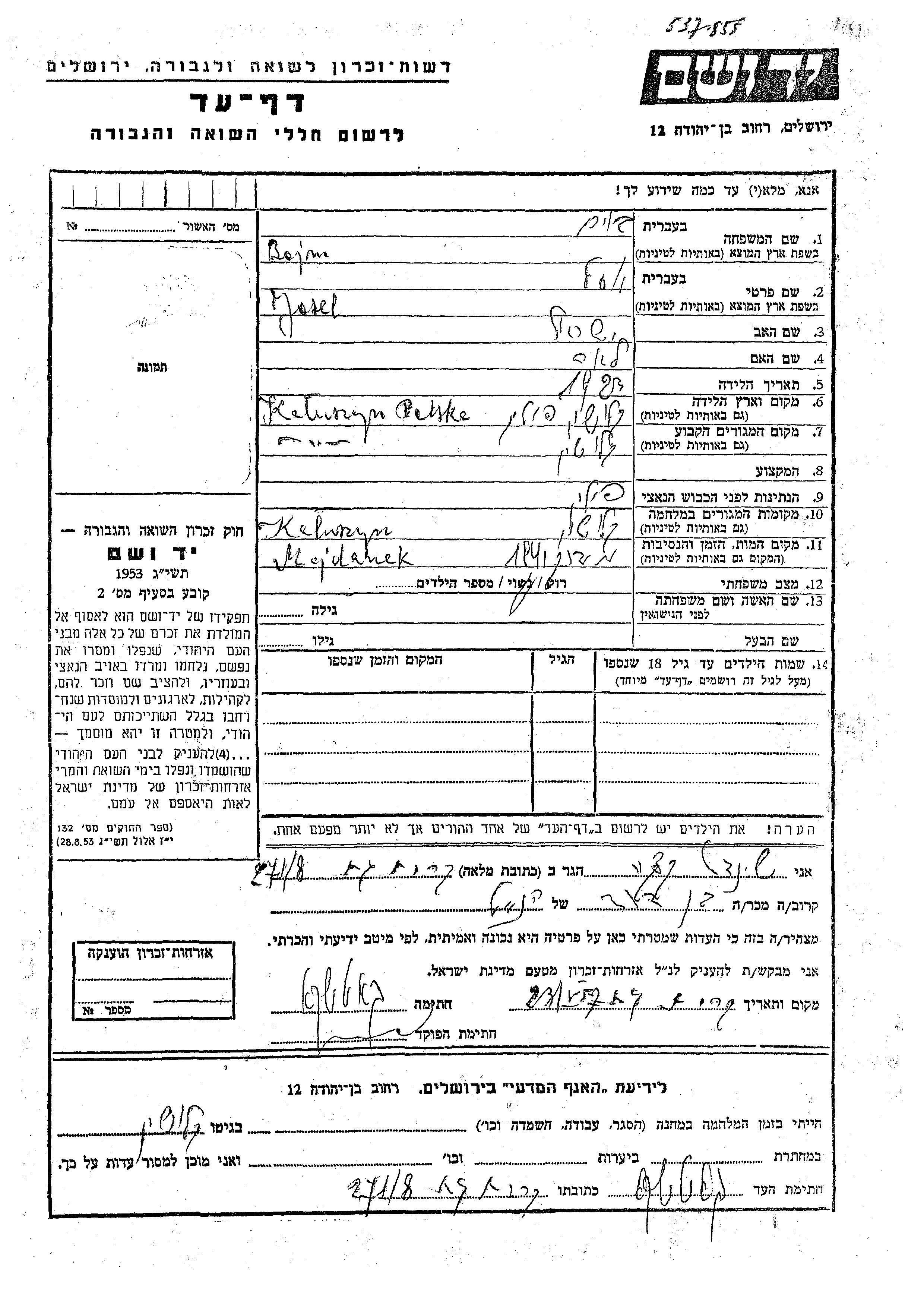Josel Boim wurde im Jahr 1923 in Kaluszyn, Polen geboren. Er war der Sohn von Yisrael und Lea. Er war Ledig. Vor dem Zweiten Weltkrieg lebte er in Kaluszyn, Polen. Während des Krieges war er in Kaluszyn, Polen.