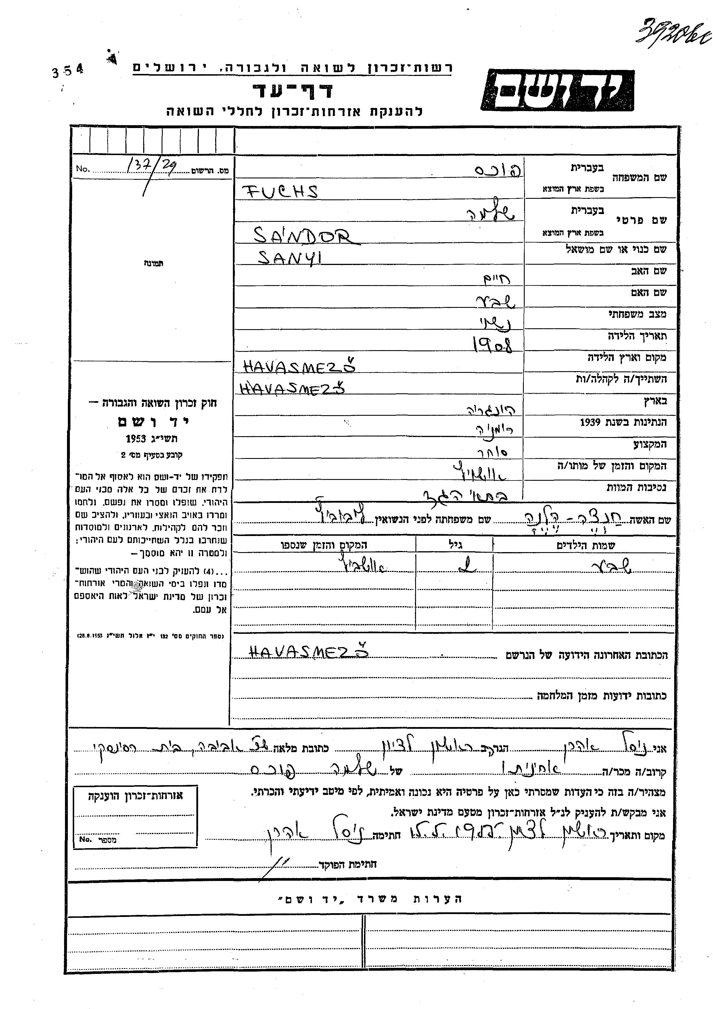 Fuchs Sandor Shlomo 1908 Havasmezo, Rumänien Gedenkblatt