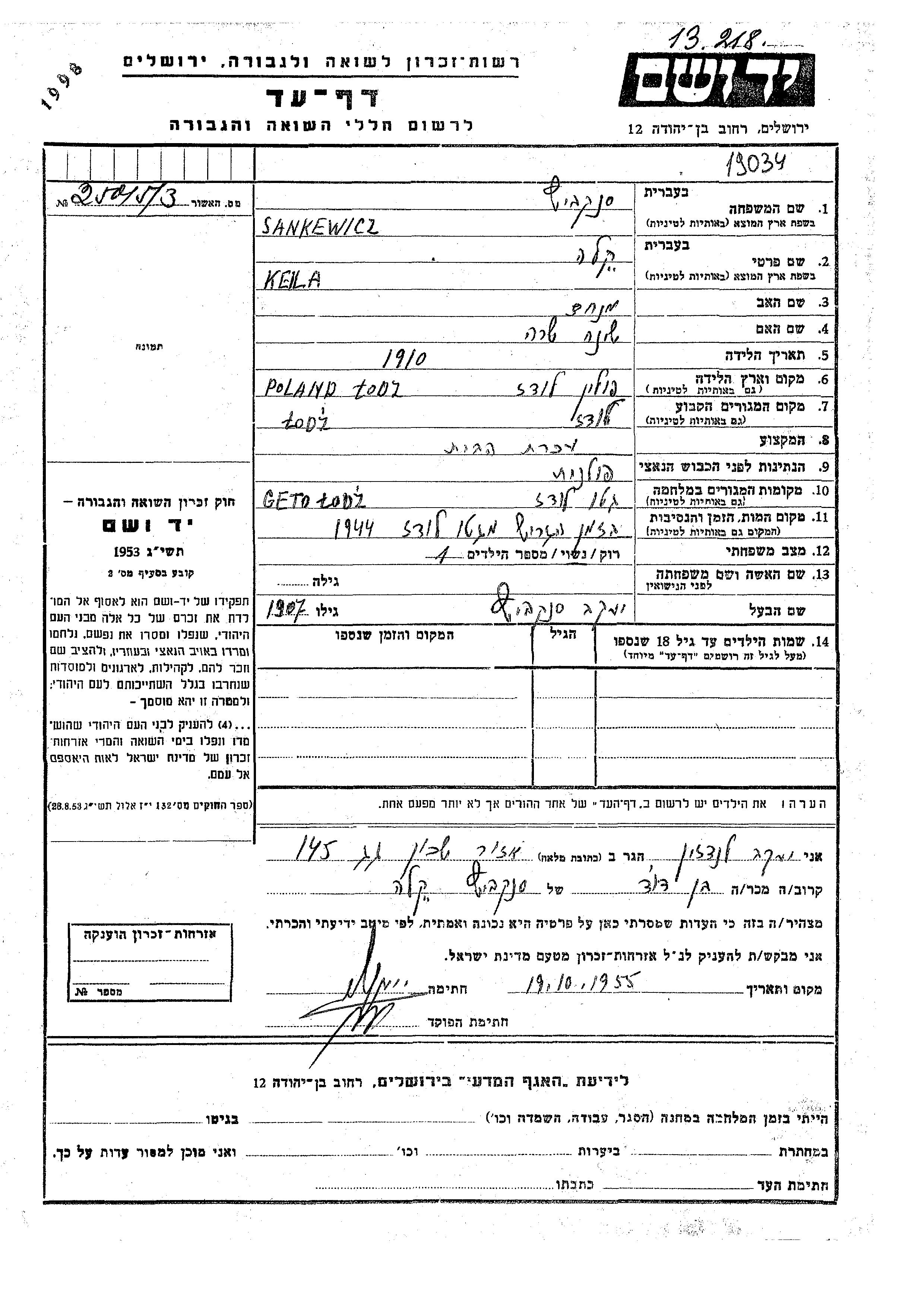 Kela Sankewicz wurde im Jahr 1910 in Lodz, Polen geboren. Sie war die Tochter von Menakhem und Sheina Sara. Sie war Hausfrau und mit Yaakov Verheiratet. Vor dem Zweiten Weltkrieg lebte sie in Lodz, Polen. Während des Krieges war sie in Lodz, Polen.