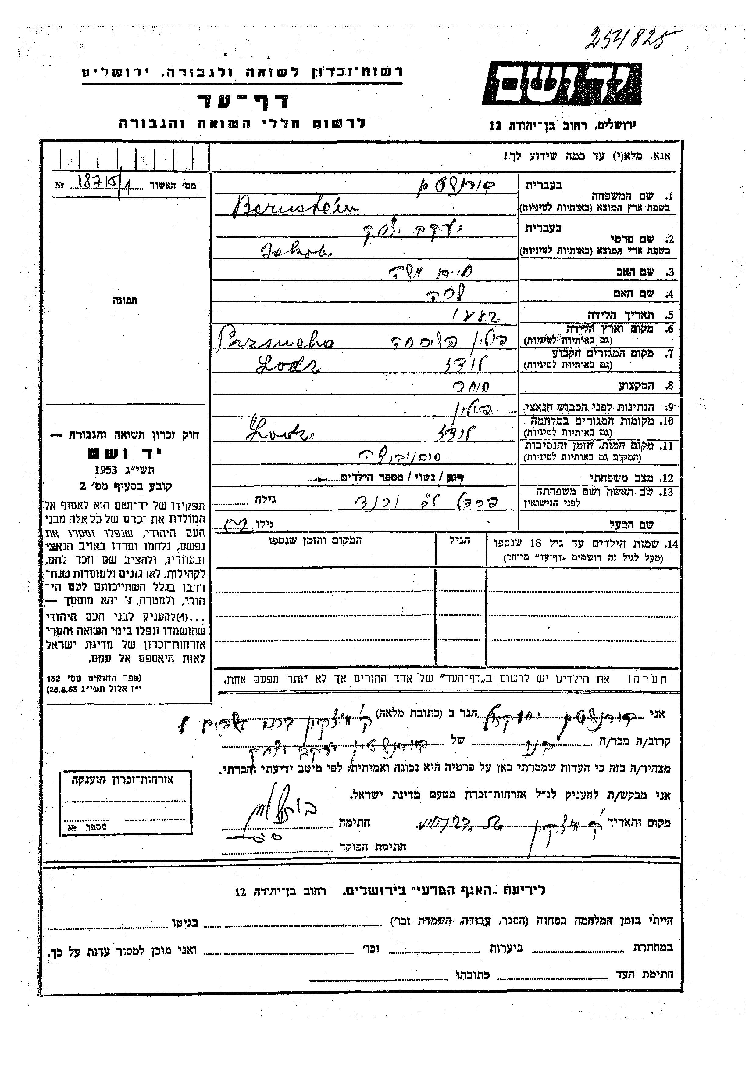 Jakob Yitzkhak Bornstein wurde im Jahr 1882 in Przemysl, Polen geboren. Er war der Sohn von Khaim Moshe und Sara. Er war Kaufmann/-frau und mit Fradel, geb. Verand Verheiratet. Vor dem Zweiten Weltkrieg lebte er in Lodz, Polen. Während des Krieges war er in Lodz, Polen.
