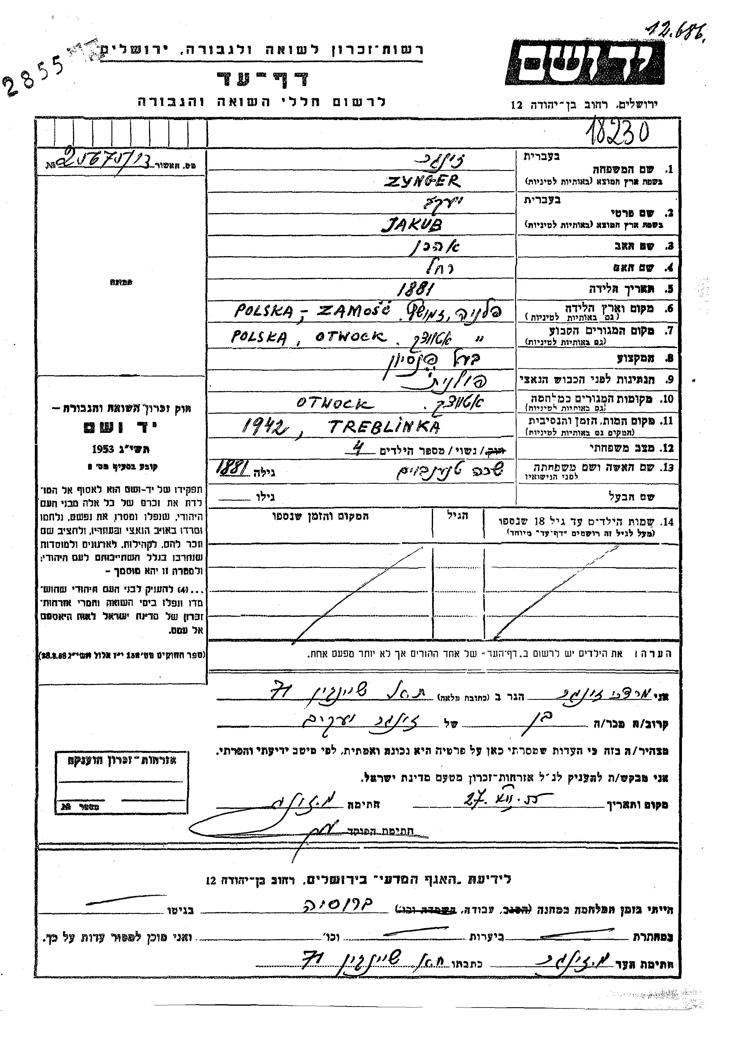 Jakub Zynger wurde im Jahr 1881 in Zamosc, Polen geboren. Er war der Sohn von Aharon und Rakhel. Er war Pensionsbesitzer und mit Sara, geb. Tannenbaum Verheiratet. Vor dem Zweiten Weltkrieg lebte er in Otwock, Polen. Während des Krieges war er in Otwock, Polen.