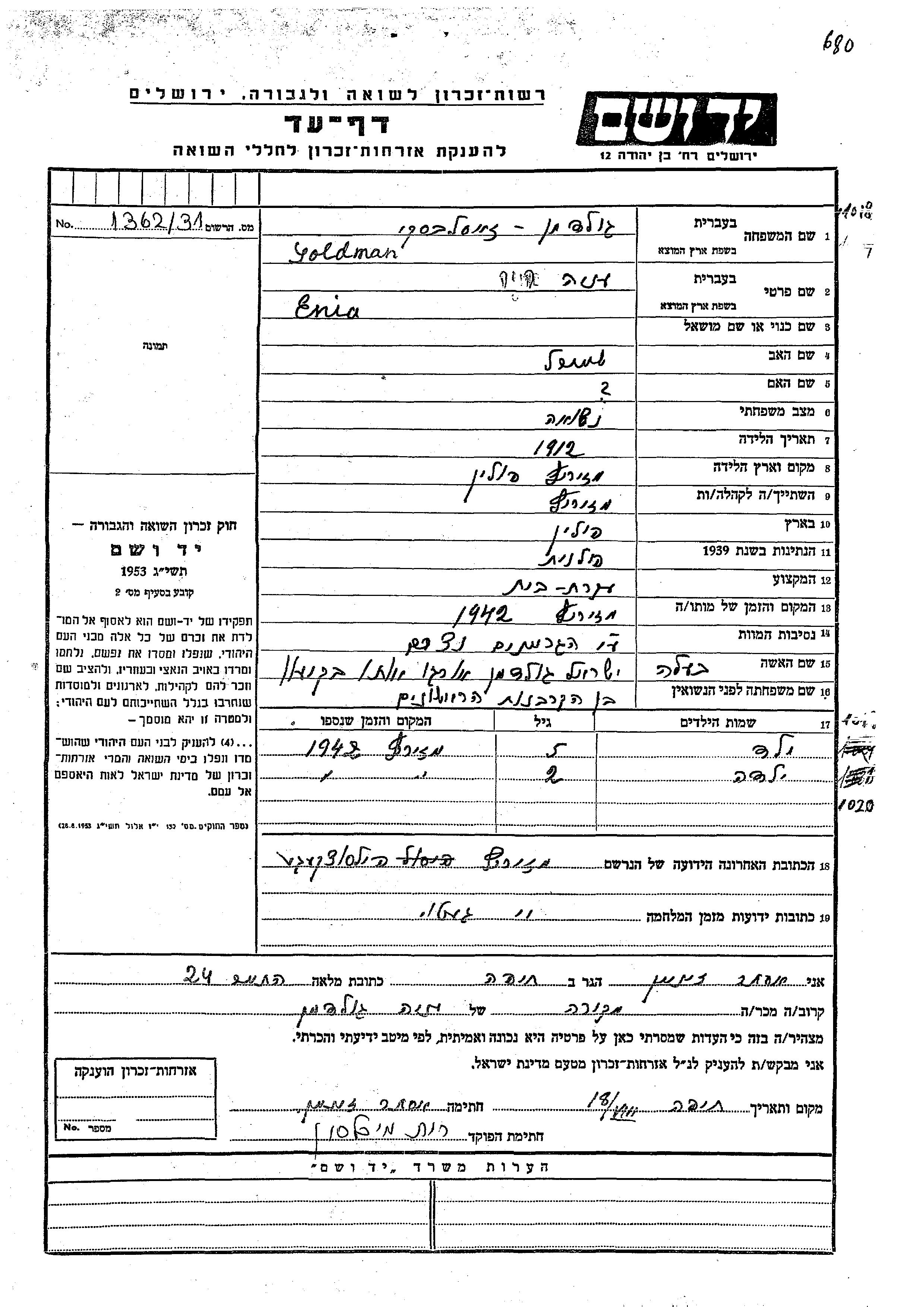 Enia Khaia Goldman, geb. Zaslavski wurde im Jahr 1912 in Miedzyrzec, Polen geboren. Sie war die Tochter von Shmariahu. Sie war Hausfrau und mit Yisrael Verheiratet. Vor dem Zweiten Weltkrieg lebte sie in Miedzyrzec, Polen. Während des Krieges war sie in Miedzyrzec, Polen.