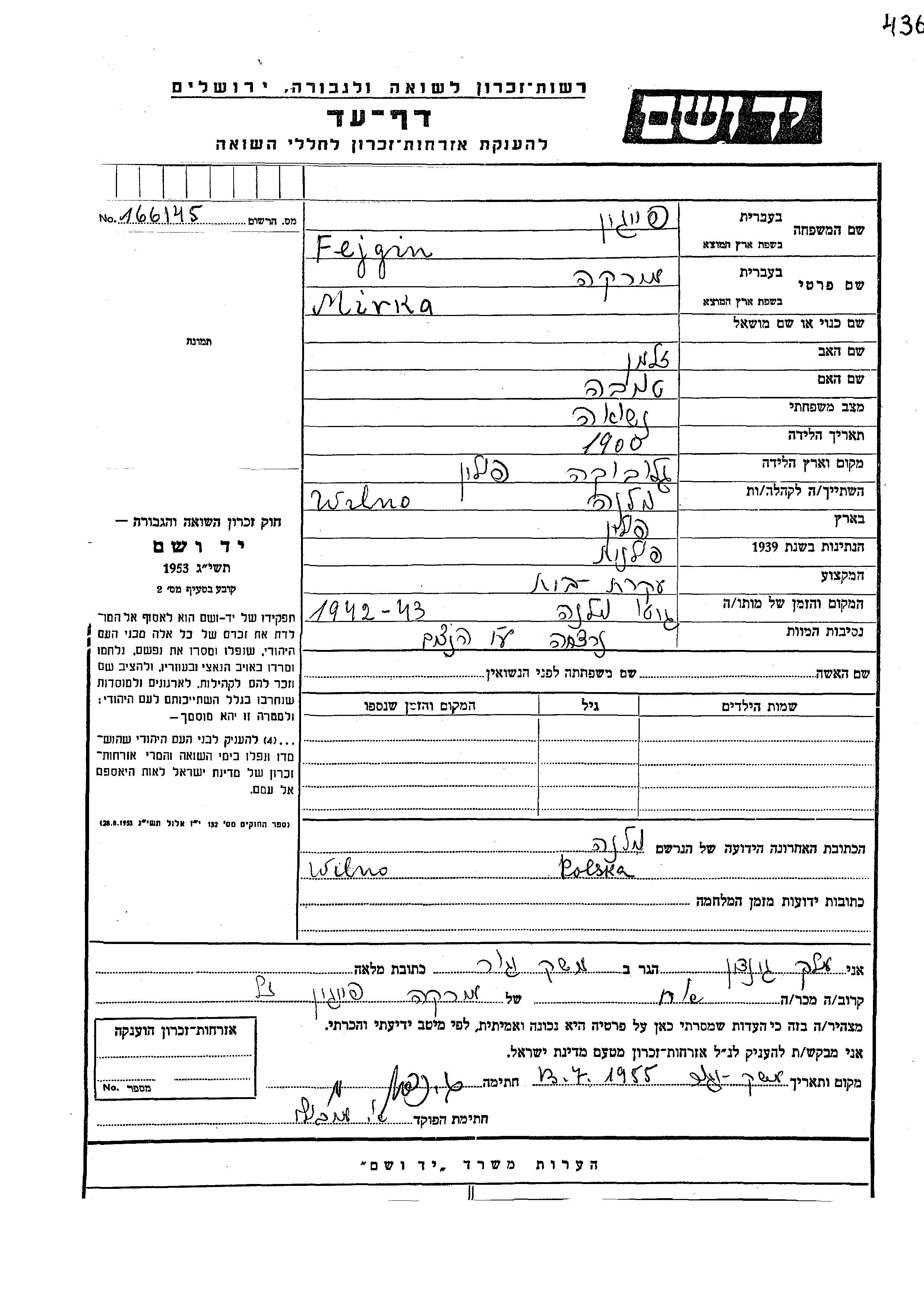 Mirka Fejgin wurde im Jahr 1900 in Glebokie, Polen geboren. Sie war die Tochter von Zalman und Toibe. Sie war Hausfrau. Vor dem Zweiten Weltkrieg lebte sie in Wilno, Polen. Während des Krieges war sie in Wilno, Polen.
