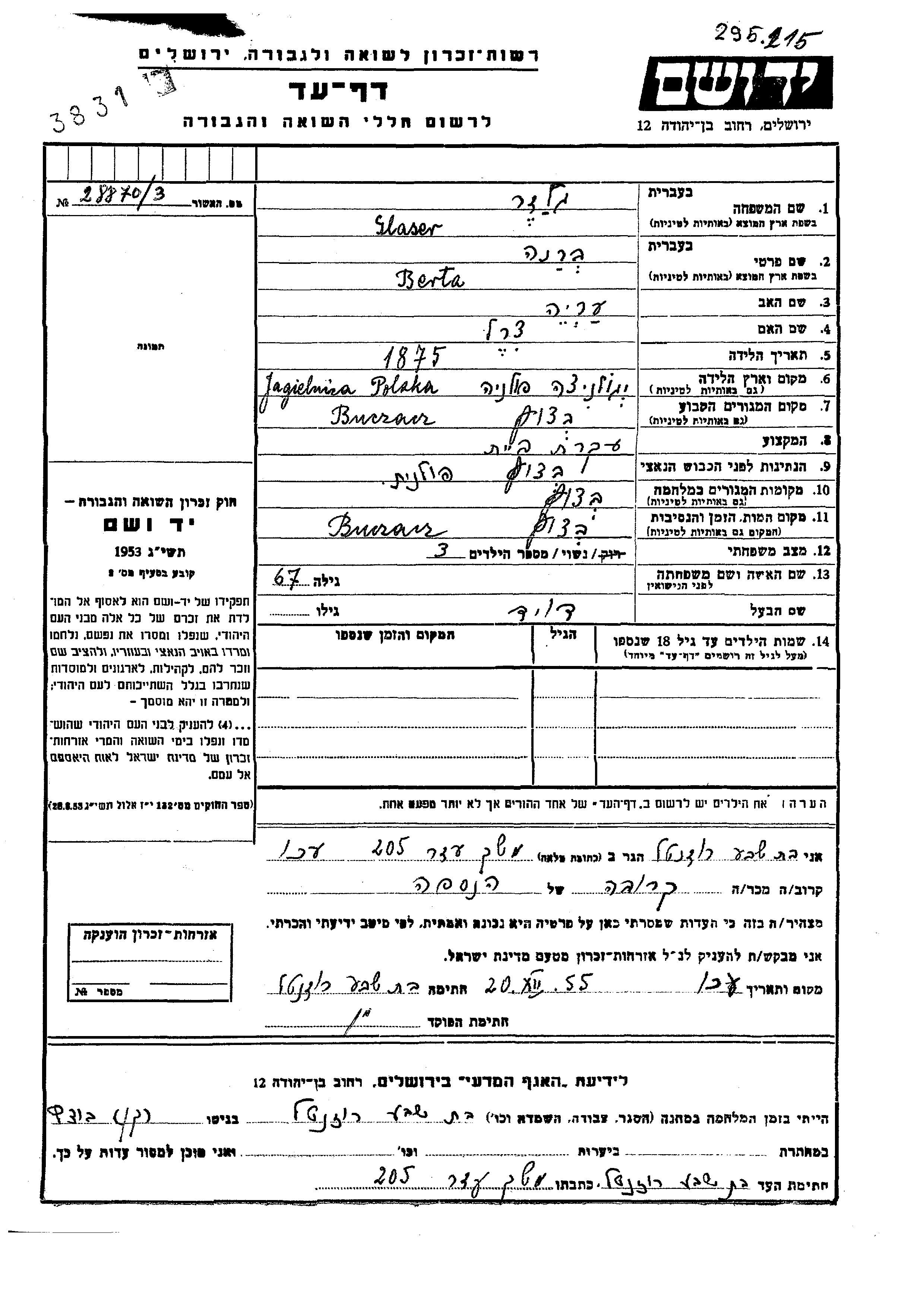 Brana Berta wurde in der Schoah ermordet. Todesort: Buczacz, Polen.
