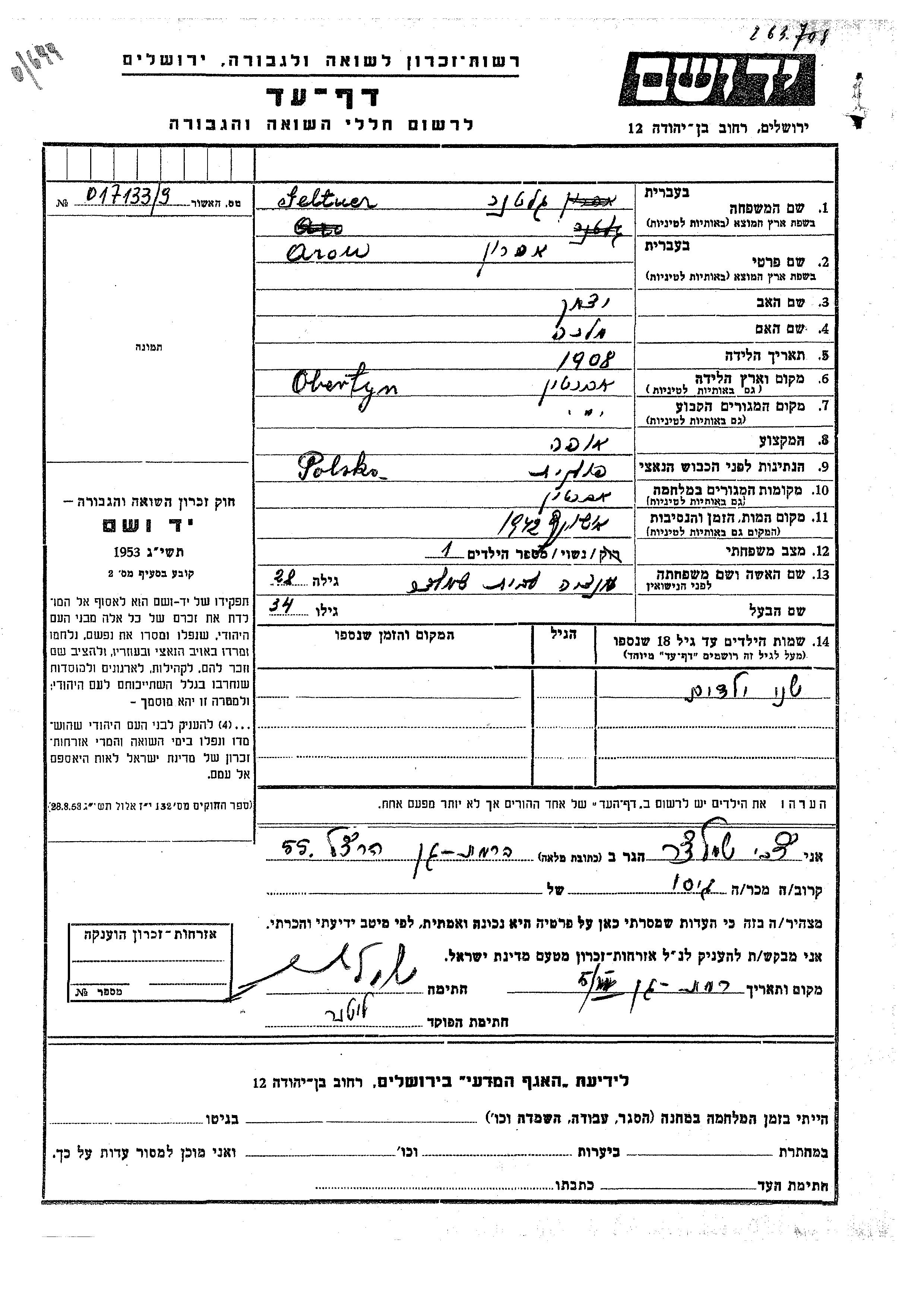 Geltner Aron 1908 Obertyn, Polen Gedenkblatt