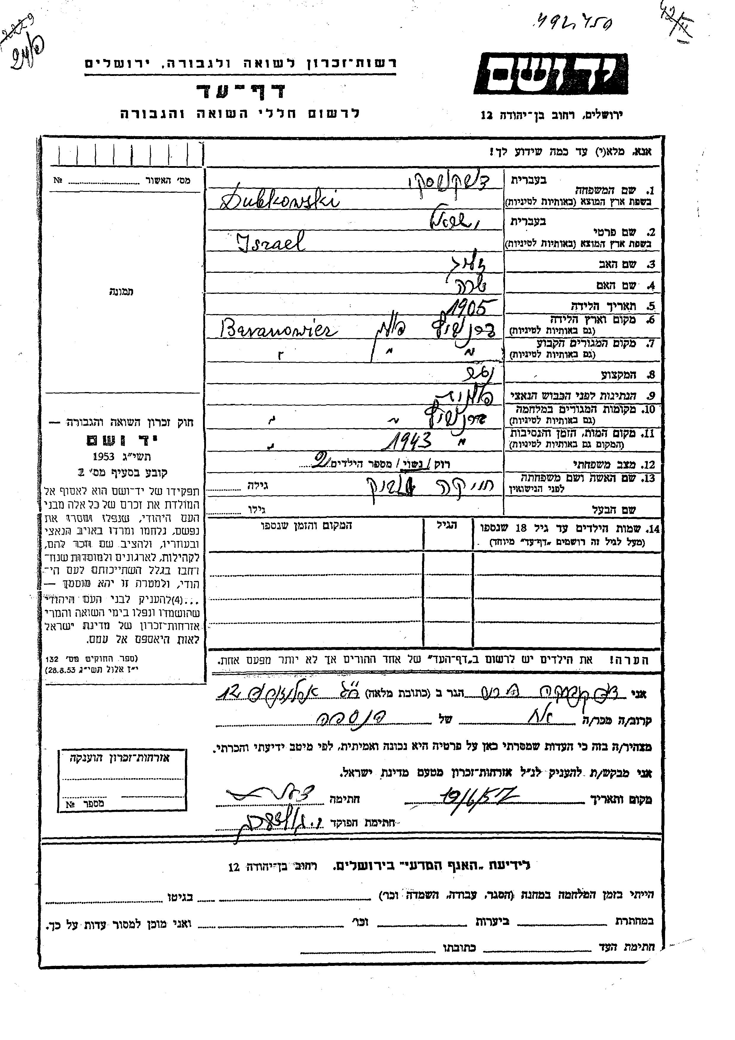 Israel Dubkowski wurde im Jahr 1905 in Baranowicz, Polen geboren. Er war der Sohn von Zelig und Sara. Er war Zimmermann und mit Khaika, geb. Novik Verheiratet. Vor dem Zweiten Weltkrieg lebte er in Baranowicz, Polen. Während des Krieges war er in Baranowicz, Polen.