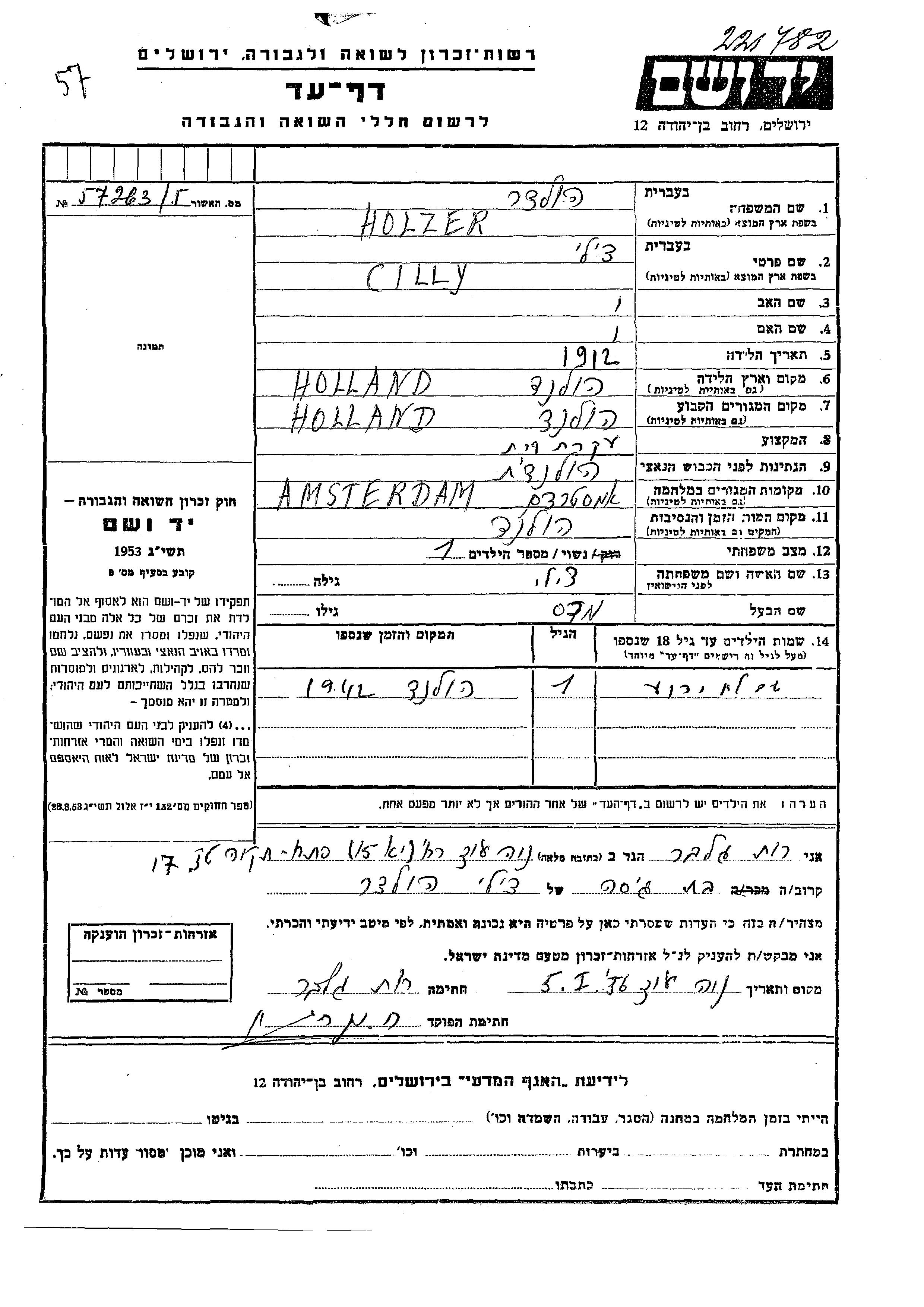 Cilly Holzer wurde im Jahr 1912 in Niederlande geboren. Sie war Hausfrau und mit Maksimilian Verheiratet. Vor dem Zweiten Weltkrieg lebte sie in Niederlande. Während des Krieges war sie in Amsterdam, Niederlande.
