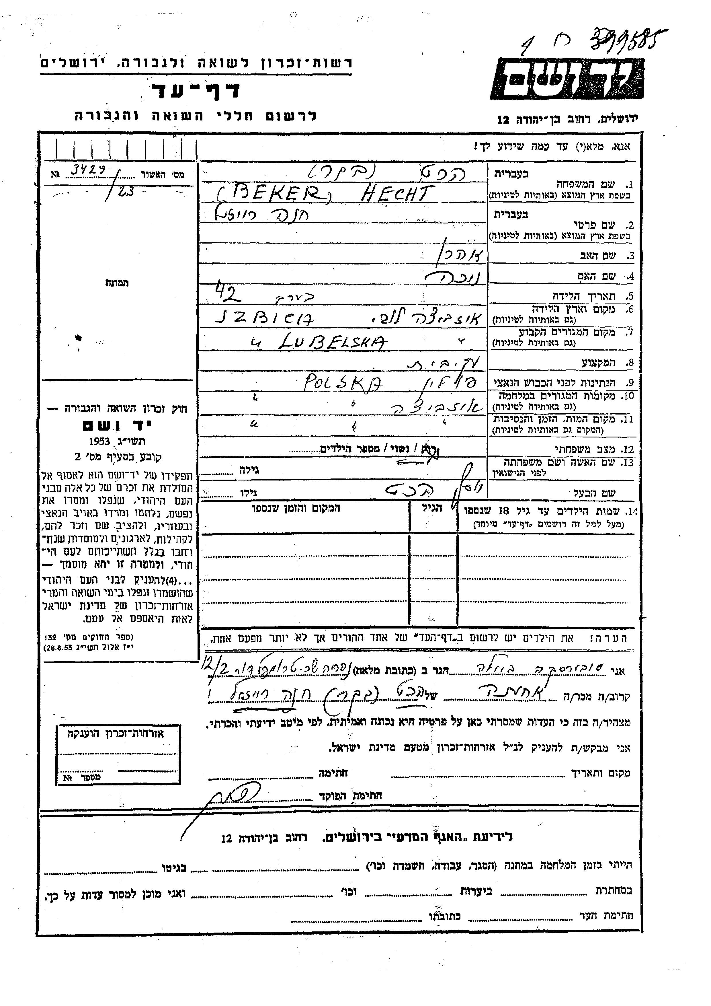 Khana Reizil Hecht, geb. Beker wurde in Izbica Lubelski, Polen geboren. Sie war die Tochter von Aharon und Nekhama. Sie war Hausfrau und mit Yosef Verheiratet. Vor dem Zweiten Weltkrieg lebte sie in Izbica Lubelski, Polen. Während des Krieges war sie in Izbica Lubelski, Polen.