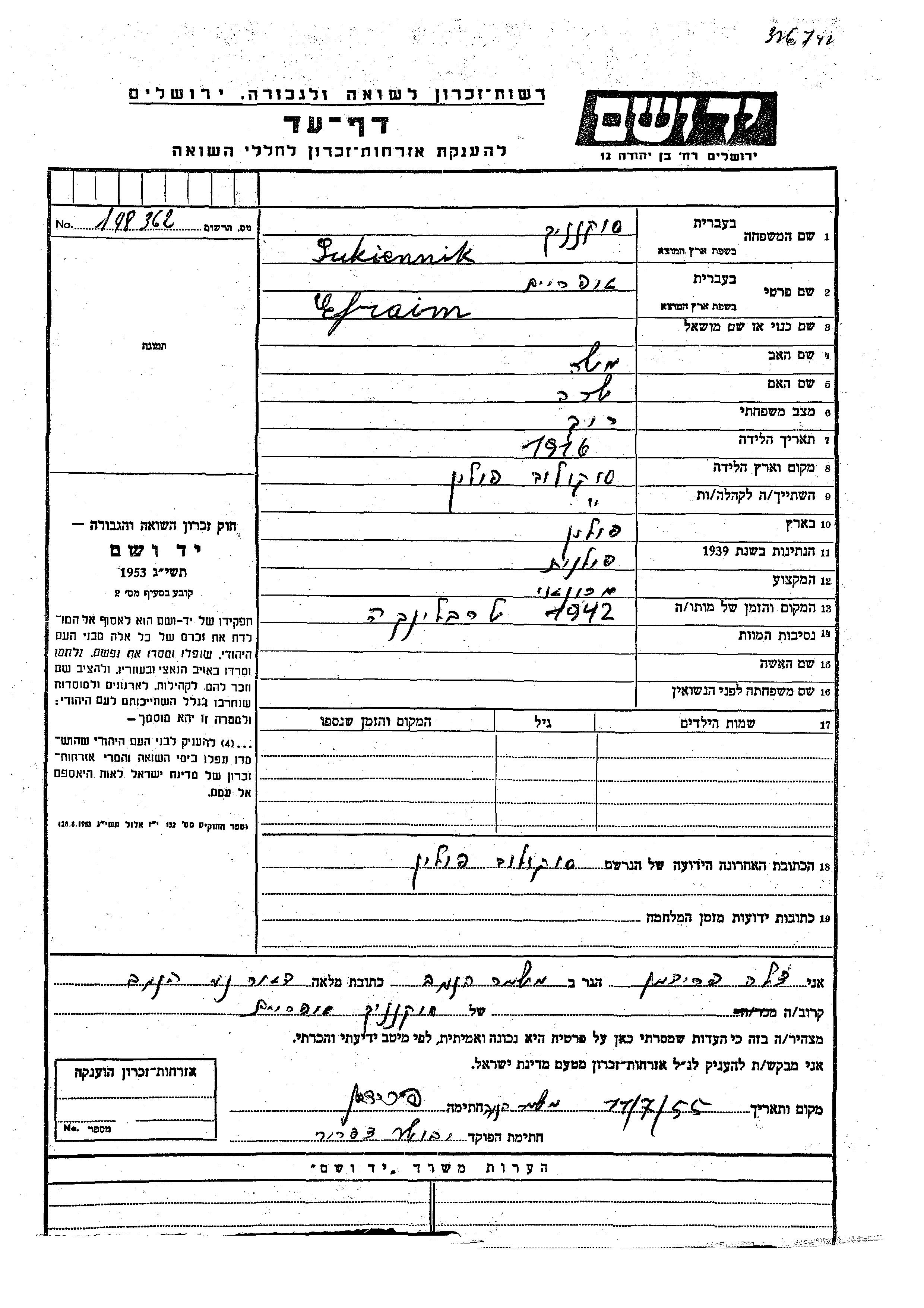 Efraim Sukiennik wurde im Jahr 1916 in Sokolow Podlaski, Polen geboren. Er war der Sohn von Moshe und Sara. Er war Mechaniker/-in und Ledig. Vor dem Zweiten Weltkrieg lebte er in Sokolow Podlaski, Polen. Während des Krieges war er in Sokolow Podlaski, Polen.