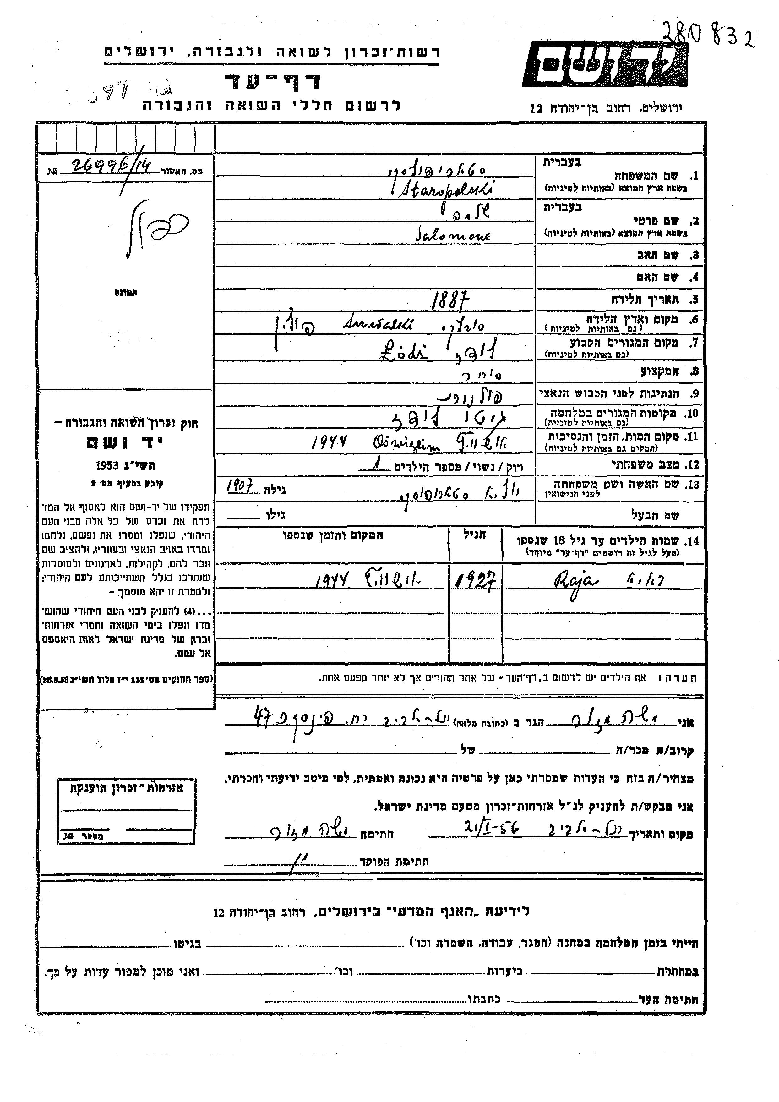 Salomon Staropolski wurde im Jahr 1887 in Suwalki, Polen geboren. Er war Kaufmann/-frau und mit Iulia Verheiratet. Vor dem Zweiten Weltkrieg lebte er in Lodz, Polen. Während des Krieges war er in Lodz, Polen.