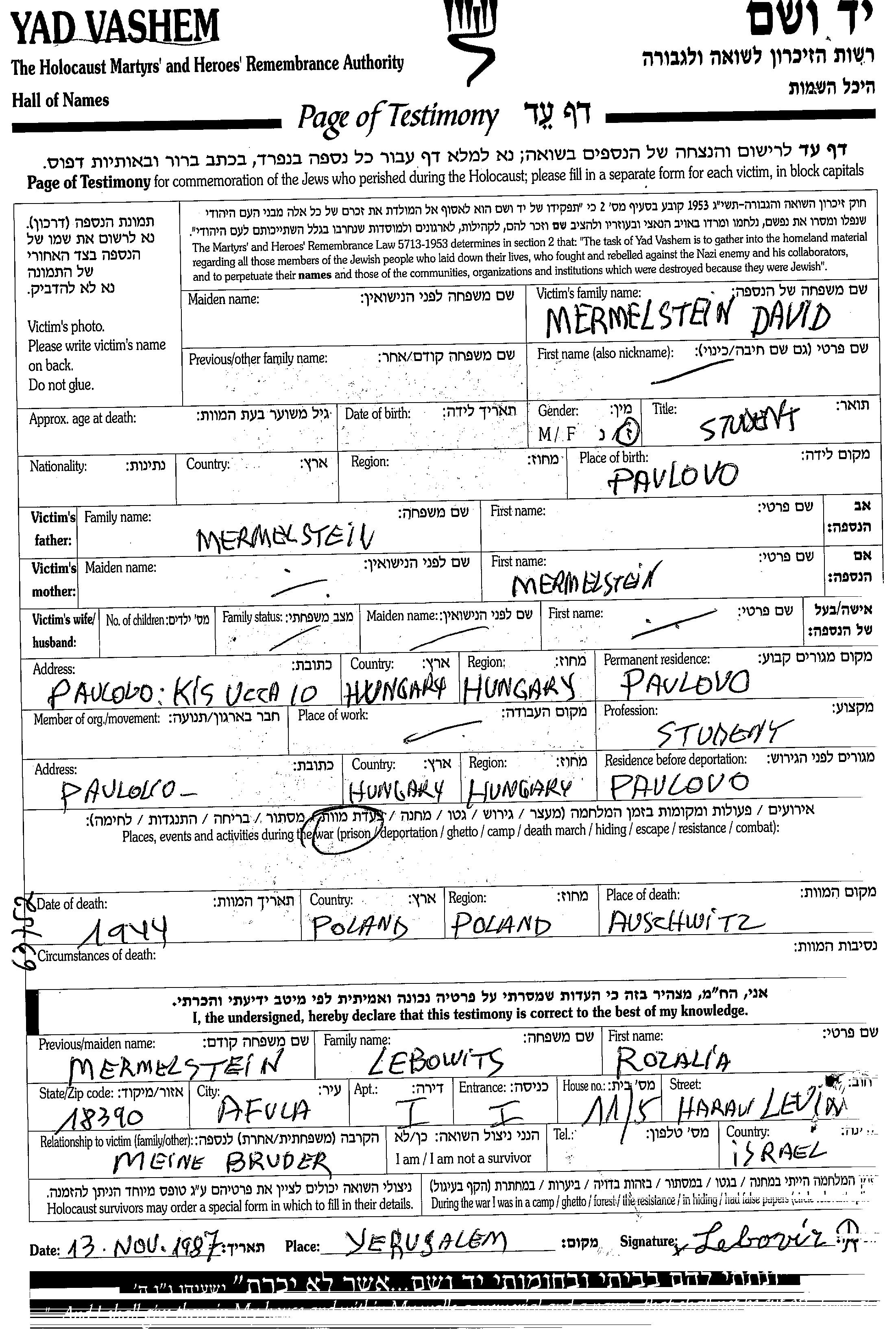 David Mermelstein wurde in Pavlovo, Tschechoslowakei geboren. Er war Student. Vor dem Zweiten Weltkrieg lebte er in Pavlovo, Tschechoslowakei. Während des Krieges war er in Pavlovo, Tschechoslowakei.