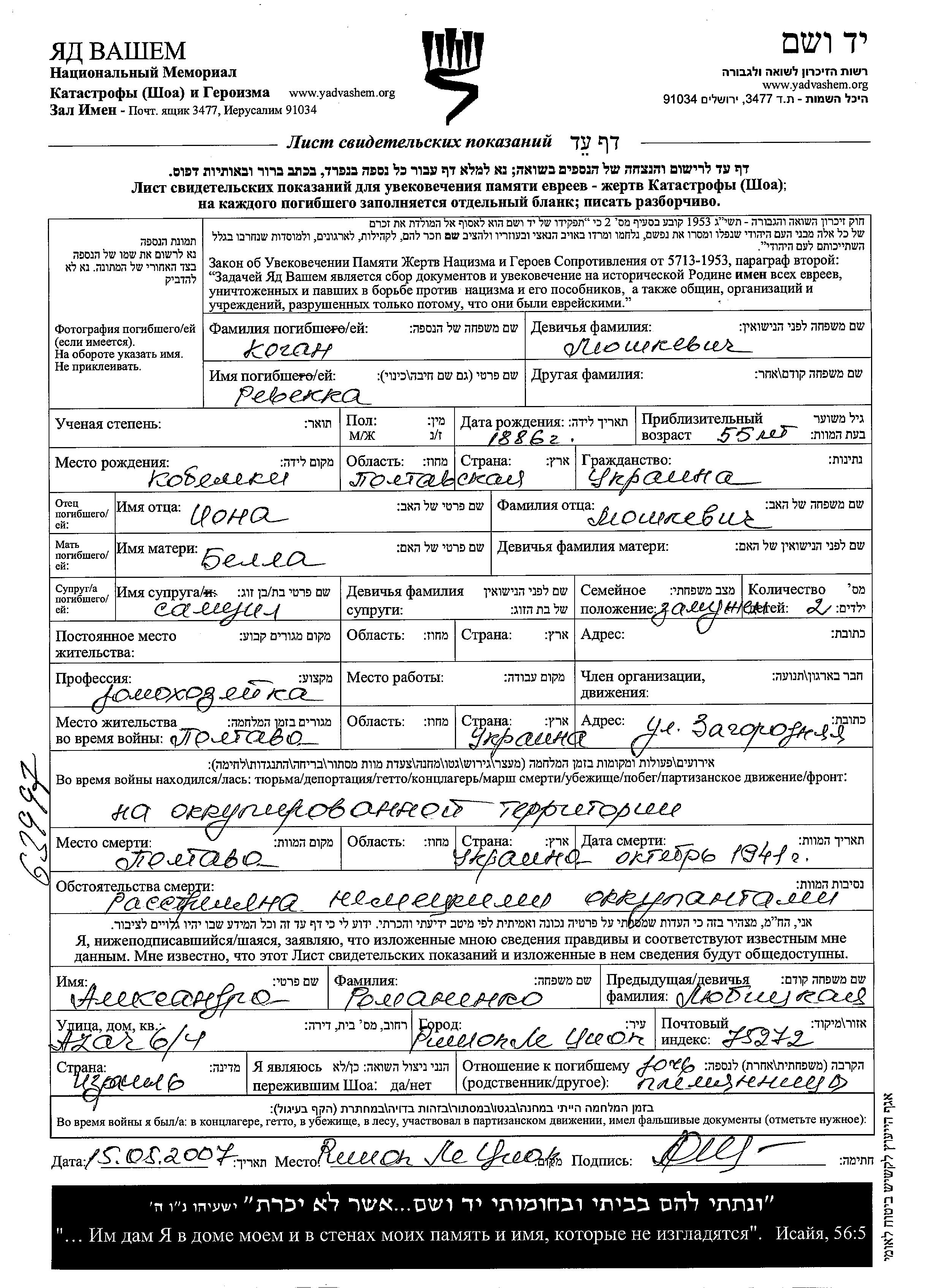 Revekka Kogan, geb. Moshkevich wurde im Jahr 1886 in Kobelyaki, Ukraine (UdSSR) geboren. Sie war die Tochter von Iona und Bella. Sie war Hausfrau und mit Samuil Verheiratet. Während des Krieges war sie in Poltava, Ukraine (UdSSR).