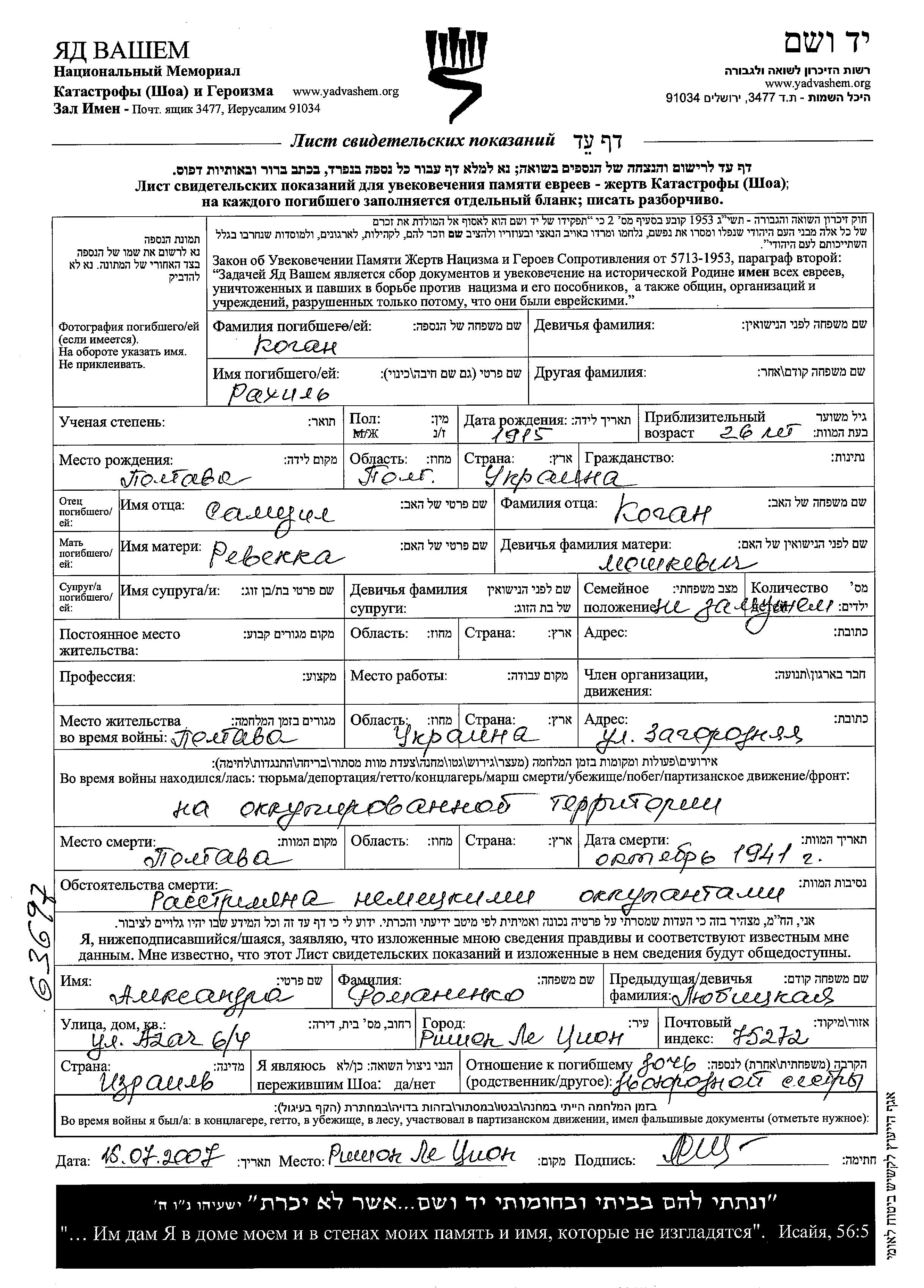 Rakhil Kogan wurde im Jahr 1915 in Poltava, Ukraine (UdSSR) geboren. Sie war die Tochter von Samuil und Rebekka, geb. Moshkevich. Sie war Ledig. Vor dem Zweiten Weltkrieg lebte sie in Poltava, Ukraine (UdSSR). Während des Krieges war sie in Poltava, Ukraine (UdSSR).