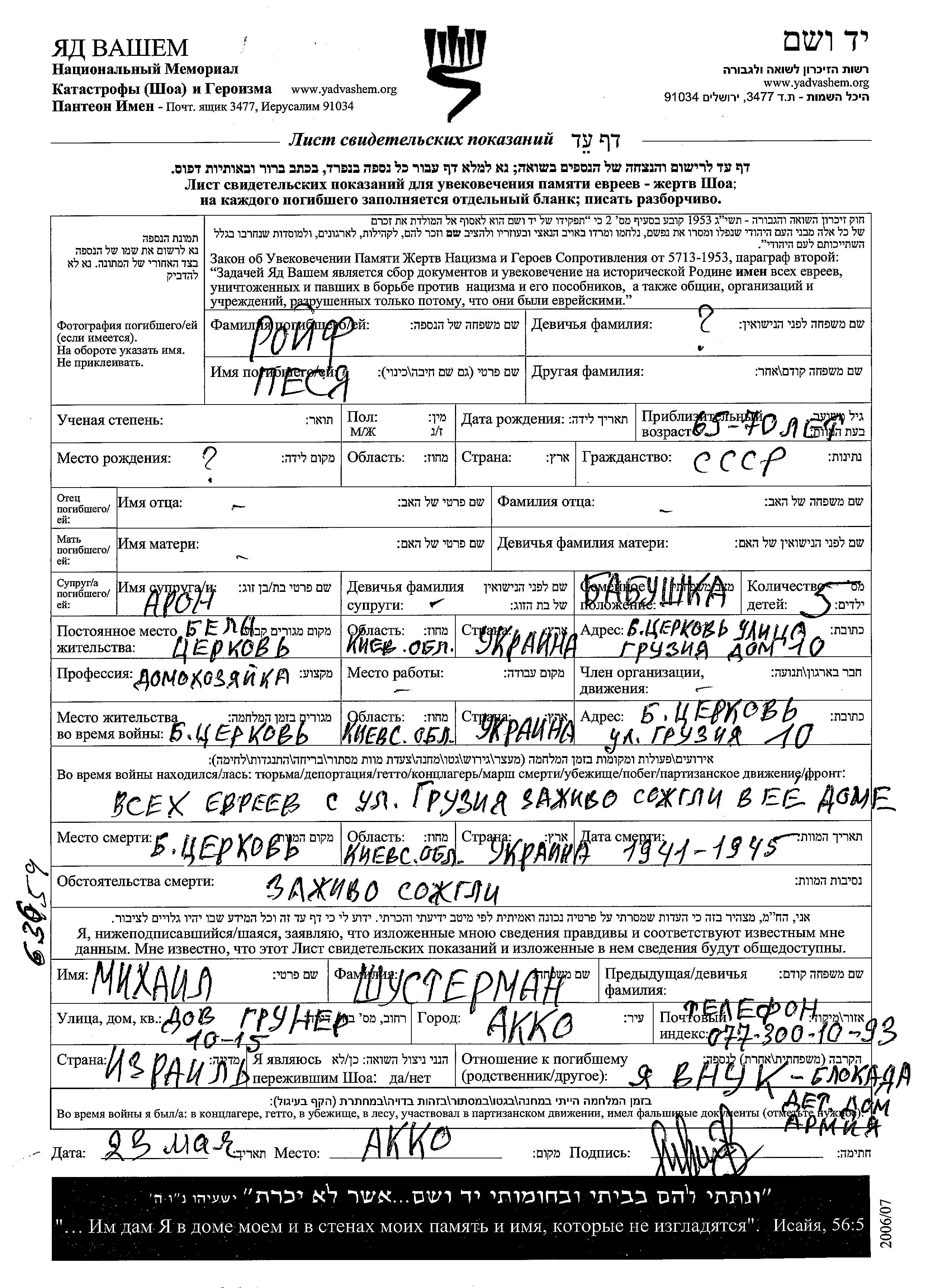 Pesya Roif. Sie war Hausfrau und mit Aron Verheiratet. Vor dem Zweiten Weltkrieg lebte sie in Belaya Tserkov, Ukraine (UdSSR). Während des Krieges war sie in Belaya Tserkov, Ukraine (UdSSR).