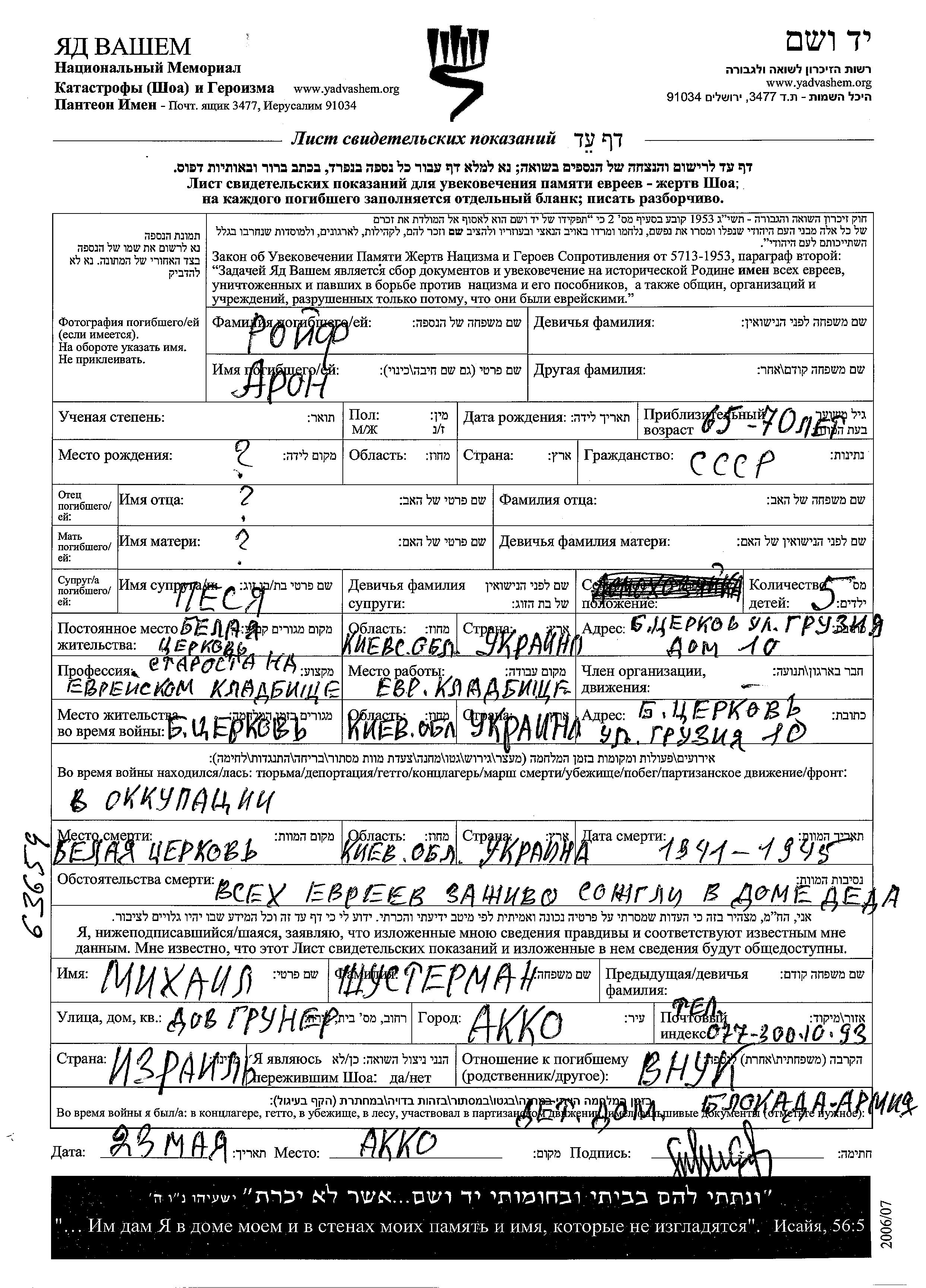 Aron Roif. Er war Starosta na yevreiskom kladbishche russian und mit Pesya Verheiratet. Vor dem Zweiten Weltkrieg lebte er in Belaya Tserkov, Ukraine (UdSSR). Während des Krieges war er in Belaya Tserkov, Ukraine (UdSSR).