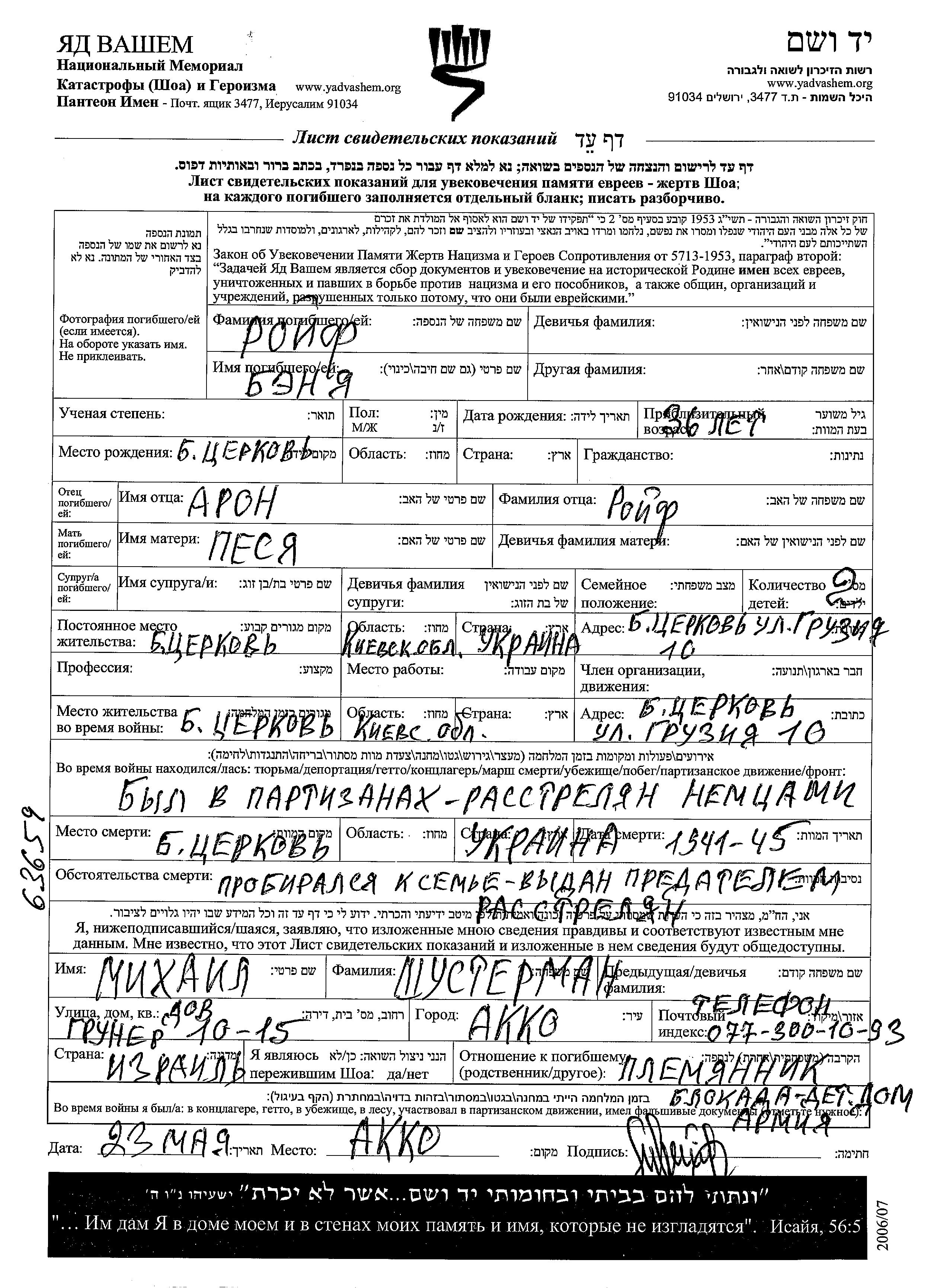 Benya wurde in der Schoah ermordet. Todesort: Belaya Tserkov, Ukraine (UdSSR).
