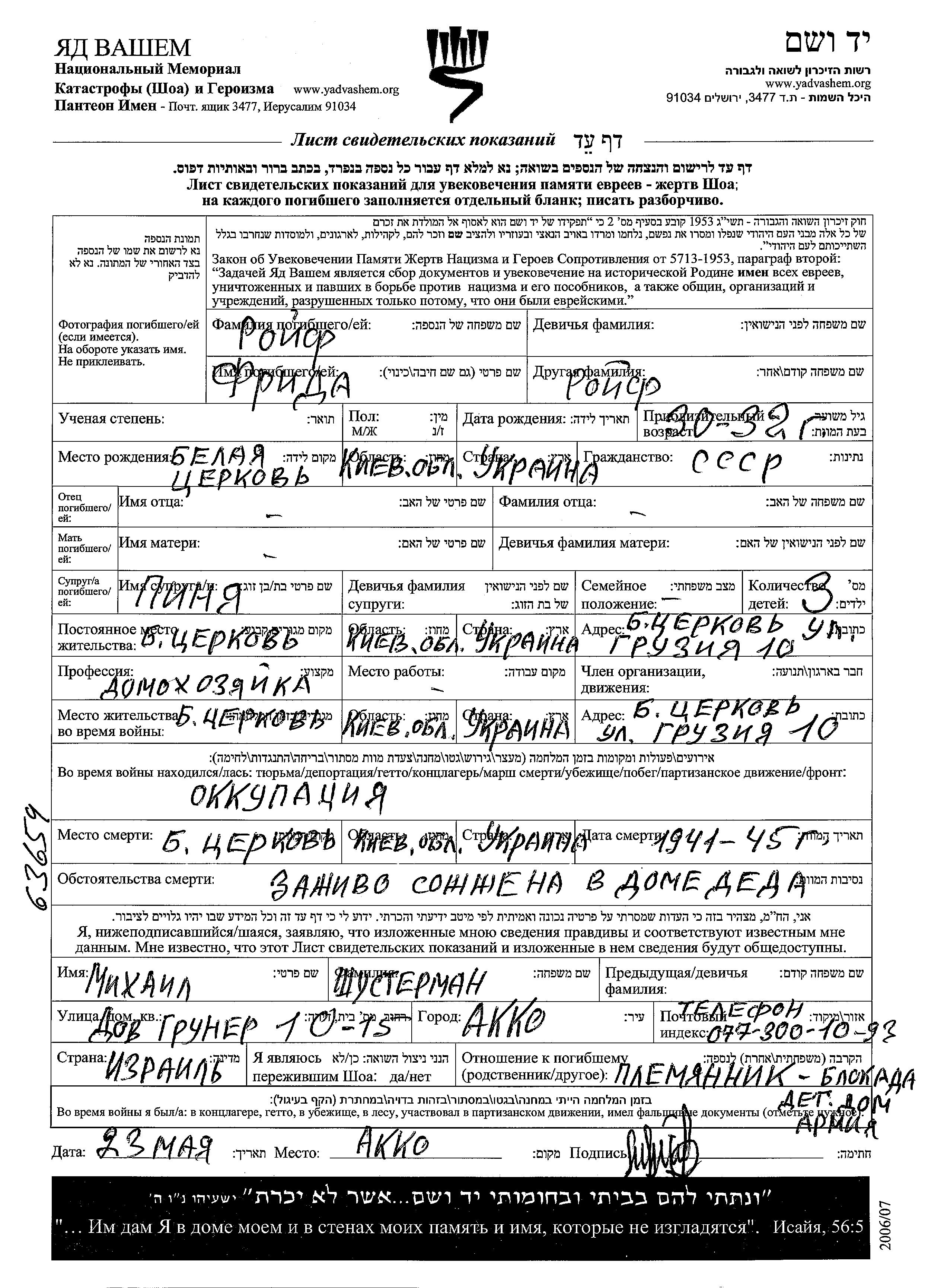 Frida Roif wurde in Belaya Tserkov, Ukraine (UdSSR) geboren. Sie war Hausfrau und mit Pinya Verheiratet. Vor dem Zweiten Weltkrieg lebte sie in Belaya Tserkov, Ukraine (UdSSR). Während des Krieges war sie in Belaya Tserkov, Ukraine (UdSSR).