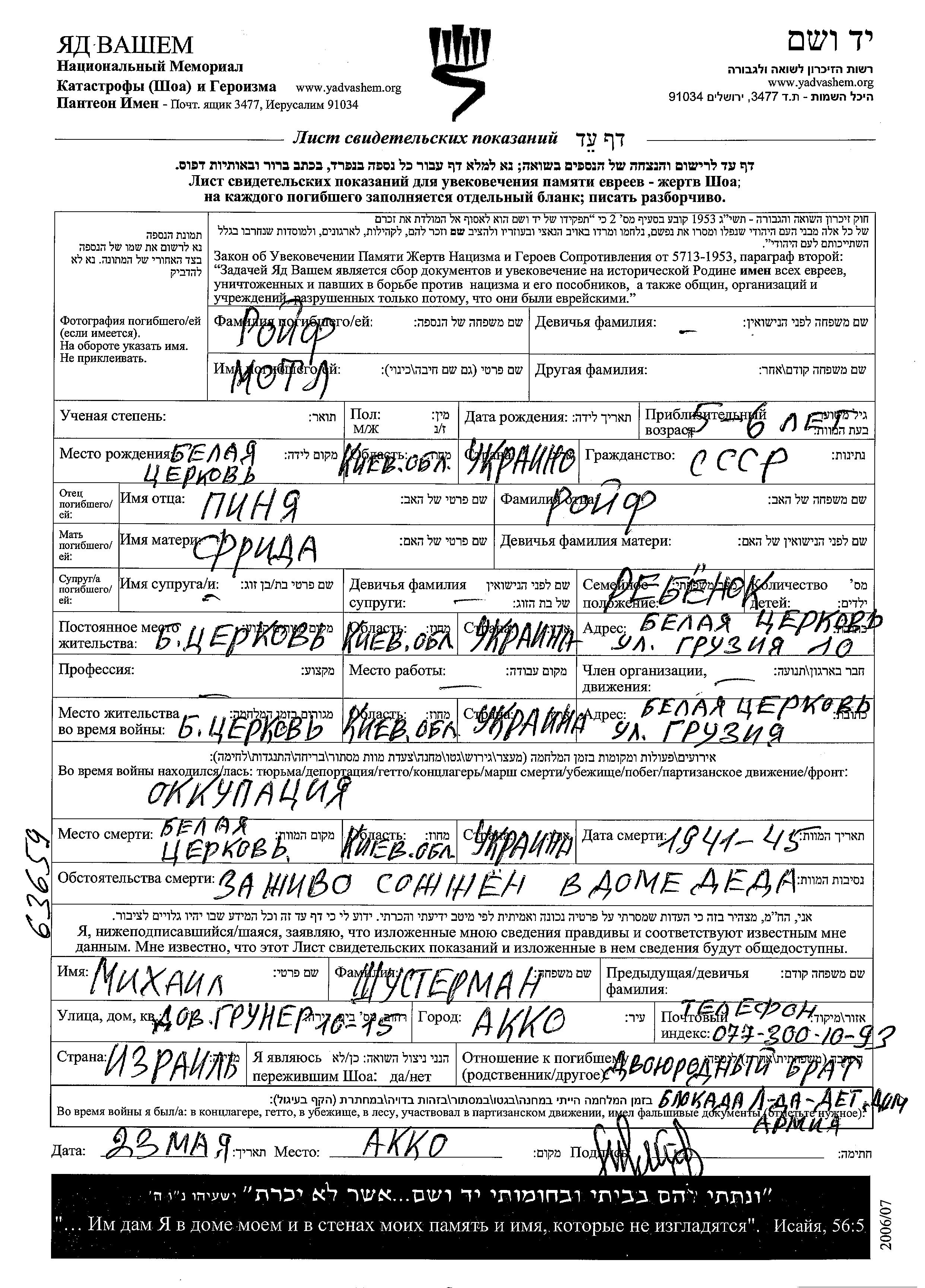 Motl Roif wurde in Belaya Tserkov, Ukraine (UdSSR) geboren. Er war der Sohn von Pinya und Frida. Er war Kind. Vor dem Zweiten Weltkrieg lebte er in Belaya Tserkov, Ukraine (UdSSR). Während des Krieges war er in Belaya Tserkov, Ukraine (UdSSR).