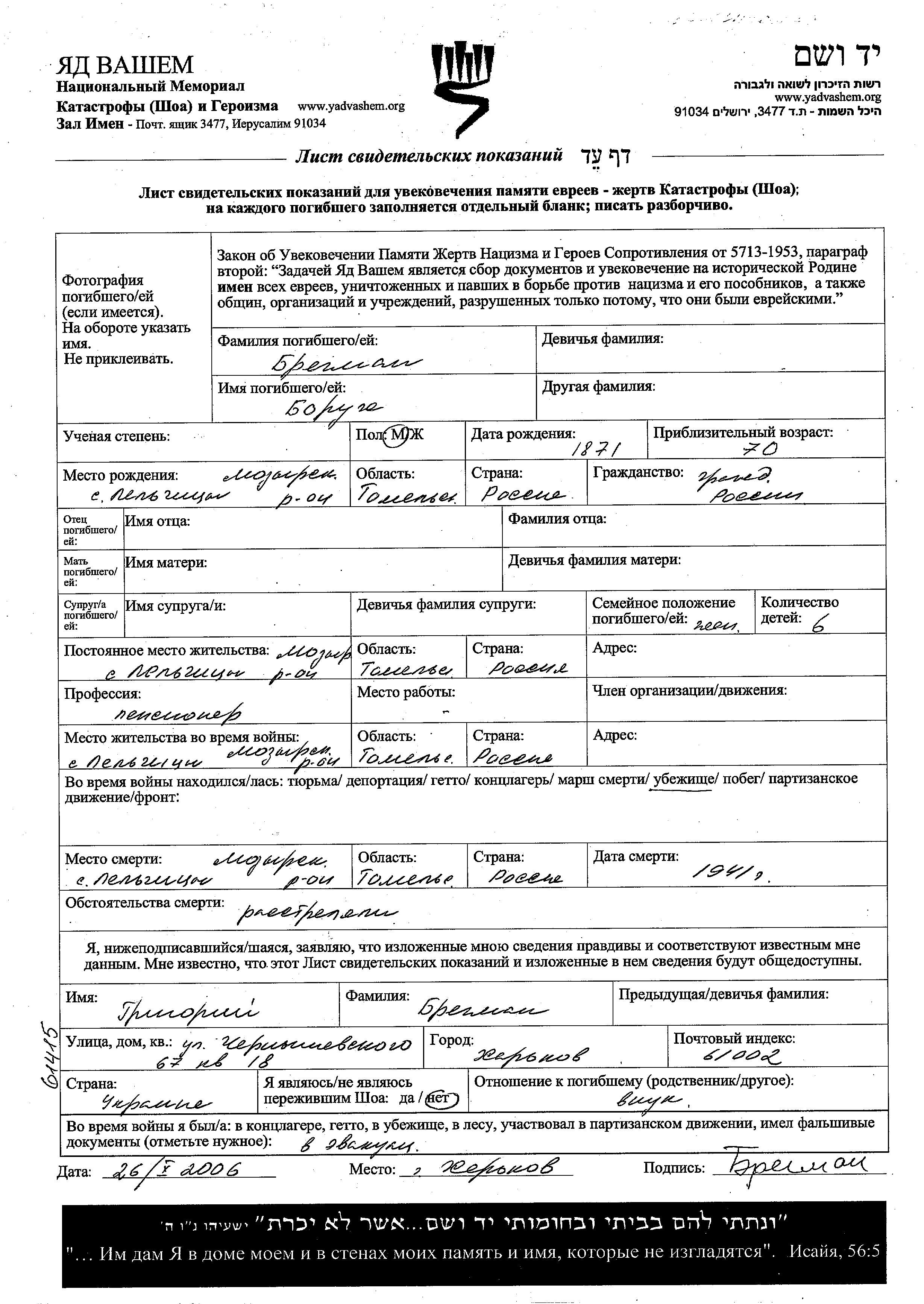 Borukh Bregman wurde im Jahr 1871 in Lelchitsy, Weißrussland (UdSSR) geboren. Er war Rentner/-in und Verheiratet. Vor dem Zweiten Weltkrieg lebte er in Lelchitsy, Weißrussland (UdSSR). Während des Krieges war er in Lelchitsy, Weißrussland (UdSSR).