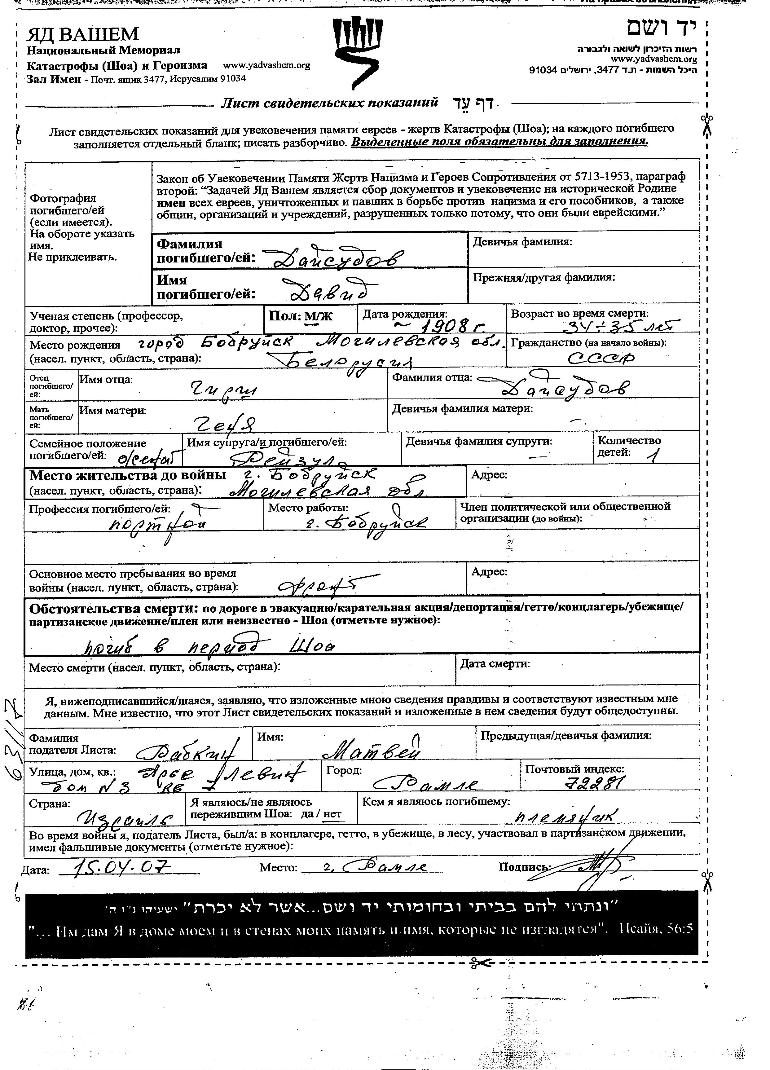 David Daisudov wurde im Jahr 1908 in Bobruisk, Weißrussland (UdSSR) geboren. Er war der Sohn von Girsh und Genya. Er war Schneider und mit Reizul Verheiratet. Vor dem Zweiten Weltkrieg lebte er in Bobruisk, Weißrussland (UdSSR). Während des Krieges war er in die Sowjetischen Streitkräfte.