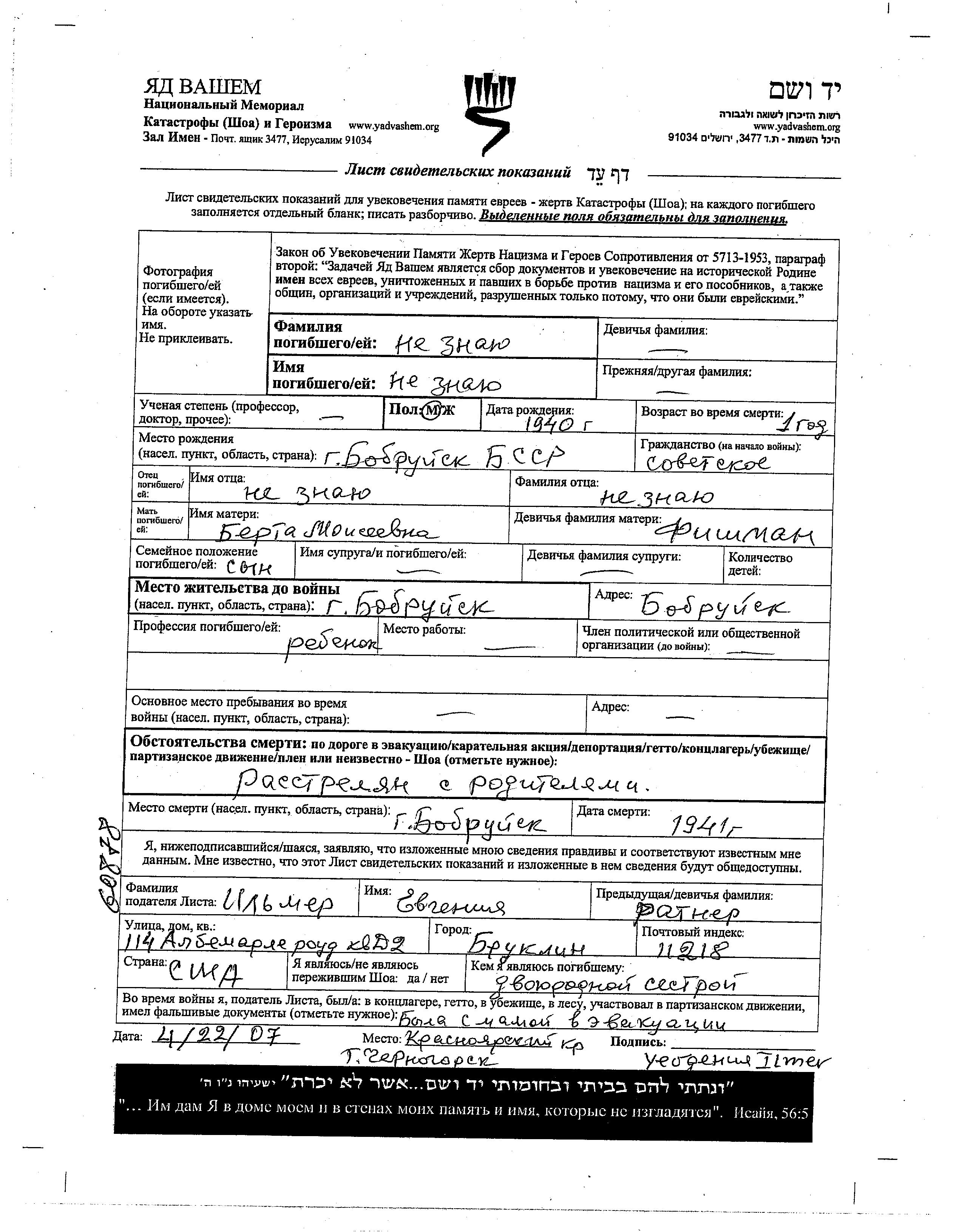 Name unbekannt Vorname unbekannt 1940 Bobruysk, Weißrussland (UdSSR) Gedenkblatt