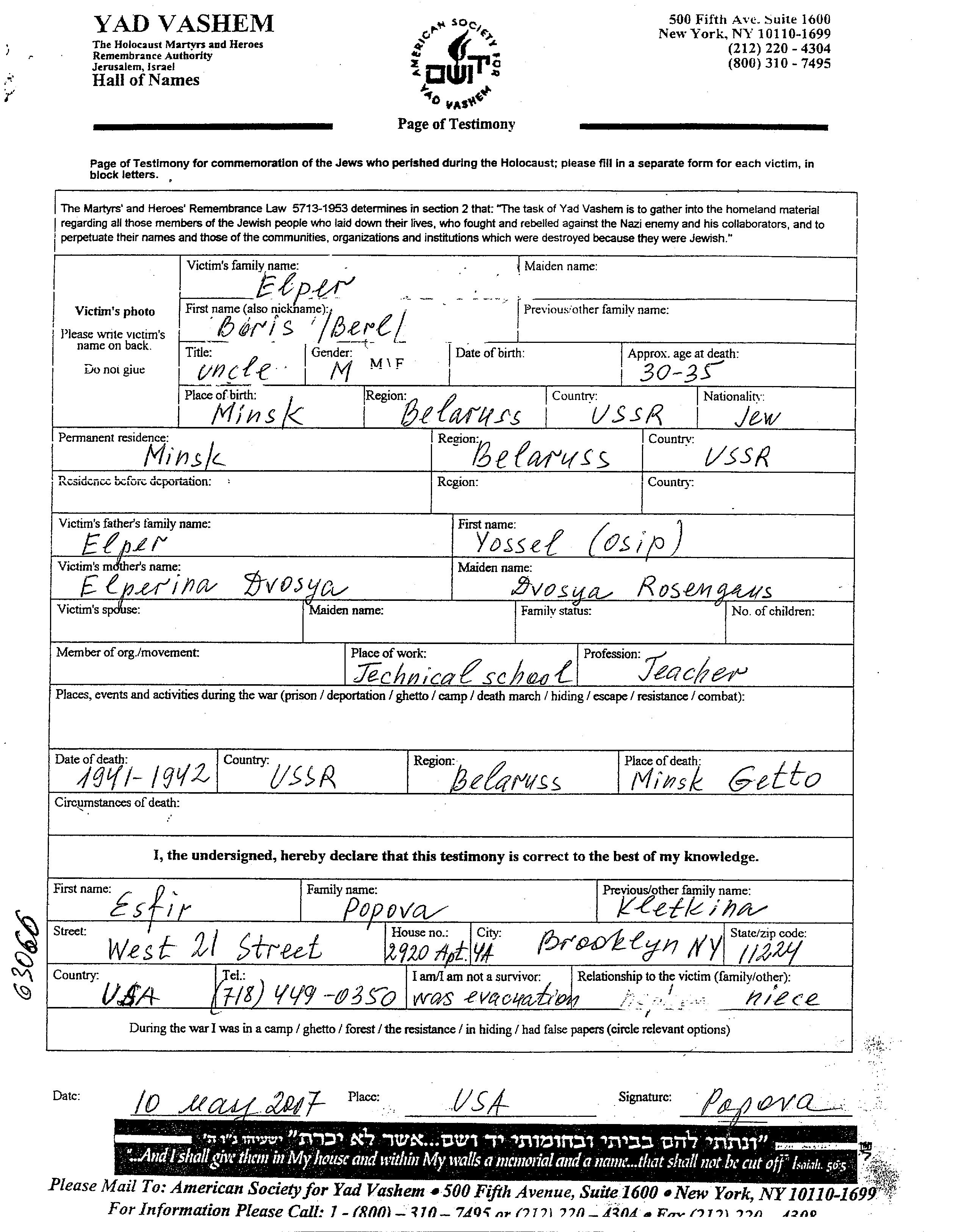 Boris Berl Elper Elperin wurde in Minsk, Weißrussland (UdSSR) geboren. Er war der Sohn von Yossel und Dvosya, geb. Rosengaus. Er war Lehrer/in. Vor dem Zweiten Weltkrieg lebte er in Minsk, Weißrussland (UdSSR). Während des Krieges war er in Minsk, Weißrussland (UdSSR).