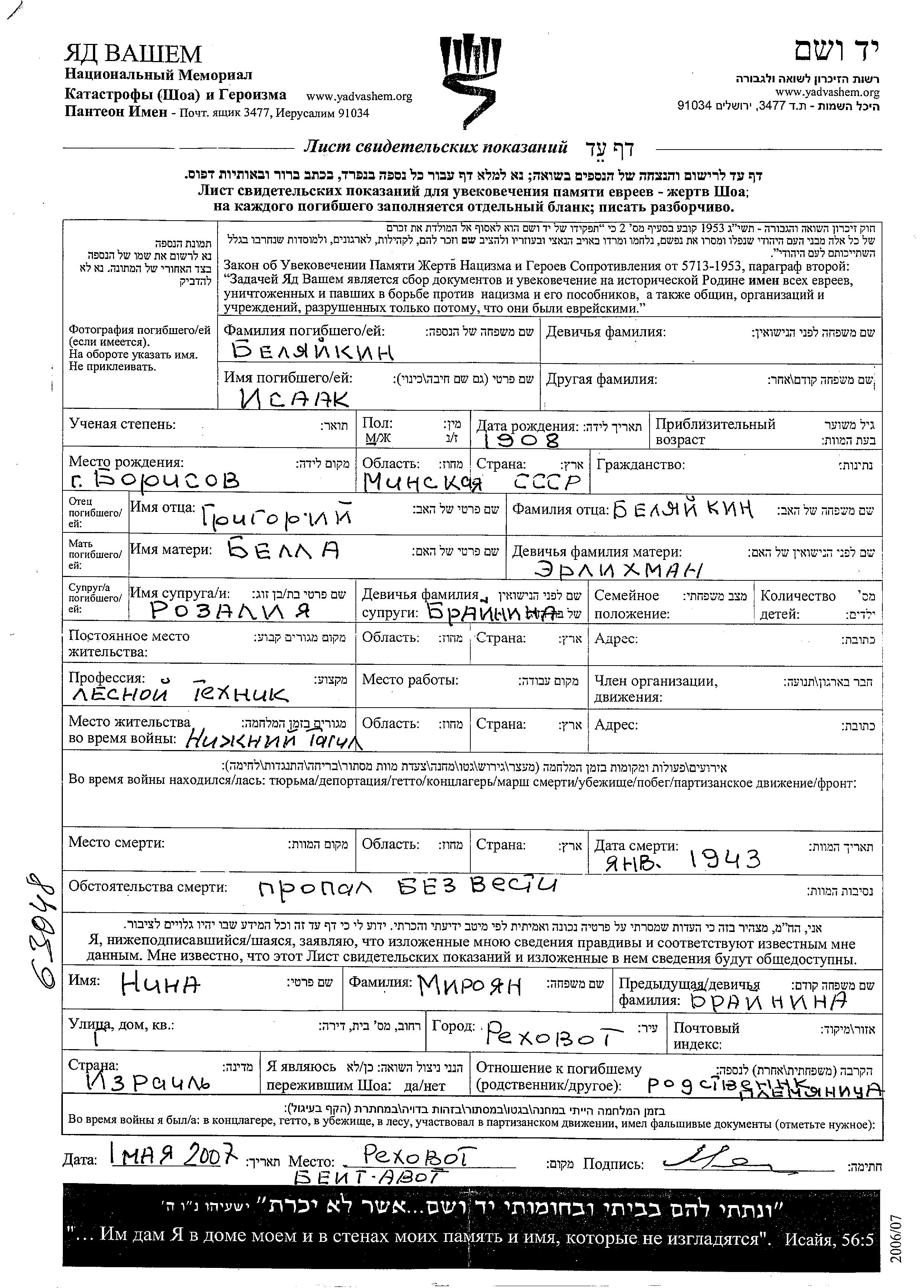 Isaak Belyaikin wurde im Jahr 1908 in Borisov, Weißrussland (UdSSR) geboren. Er war der Sohn von Grigori und Bella, geb. Erlikhman. Er war Lesnoy tekhnik und mit Rozaliya, geb. Brainina Verheiratet. Während des Krieges war er in Nizhni Tagil, Russland (UdSSR).