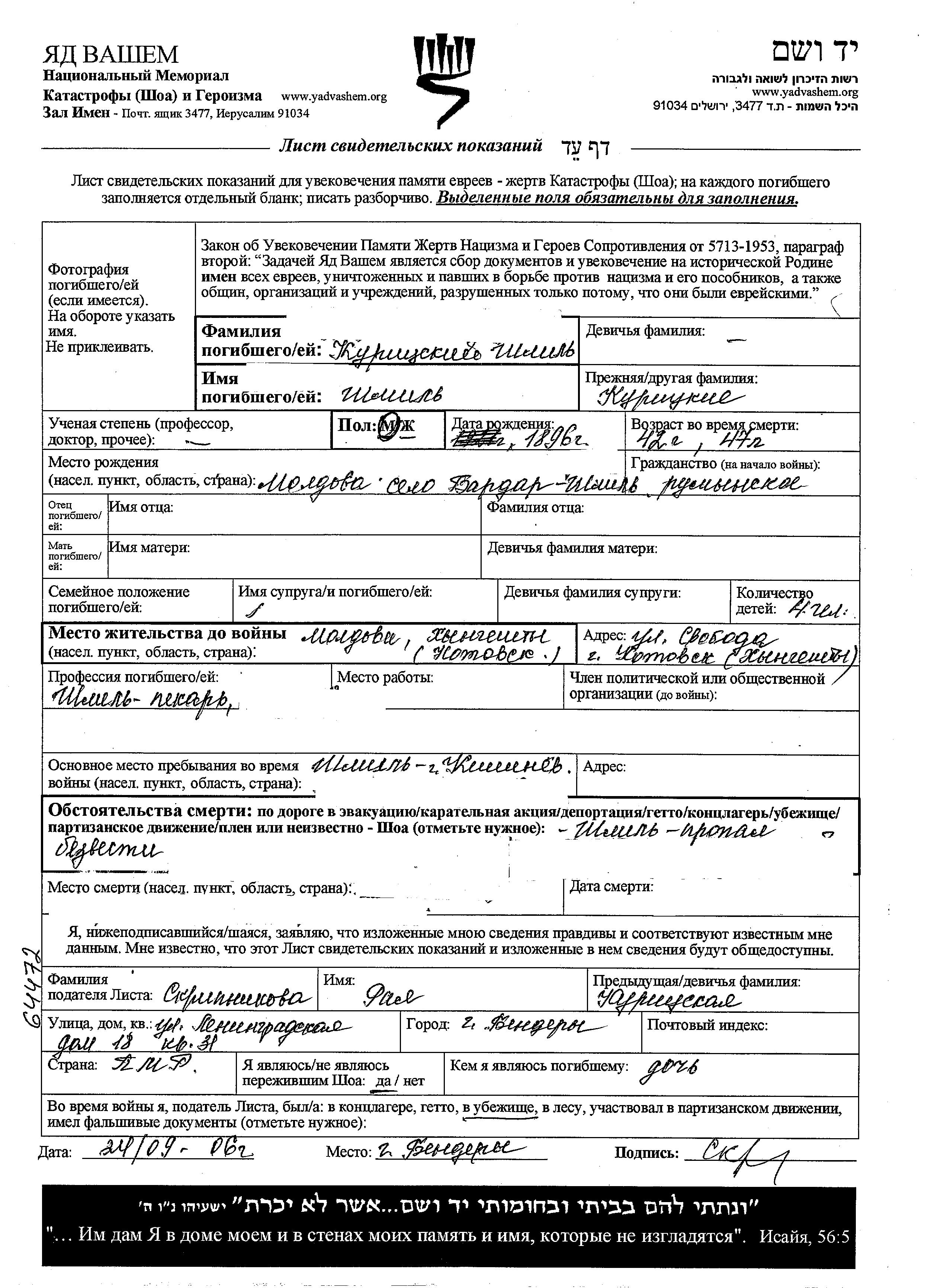 Shmil Kuritzki wurde im Jahr 1896 in Bardar, Rumänien geboren. Er war Bäcker/-in. Vor dem Zweiten Weltkrieg lebte er in Hincesti, Rumänien. Während des Krieges war er in Kishinev, Rumänien.