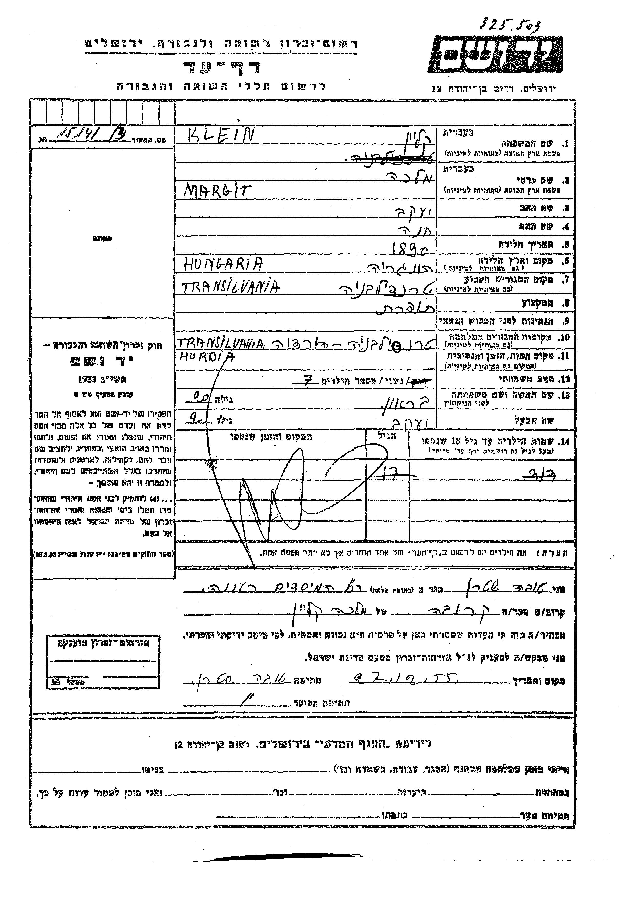 Margit Malka Klein, geb. Braun wurde im Jahr 1890 in Ungarn geboren. Sie war die Tochter von Yaakov und Khana. Sie war Schneiderin und mit Yaakov Verheiratet. Vor dem Zweiten Weltkrieg lebte sie in Transylvania, Rumänien. Während des Krieges war sie in Transylvania, Rumänien.