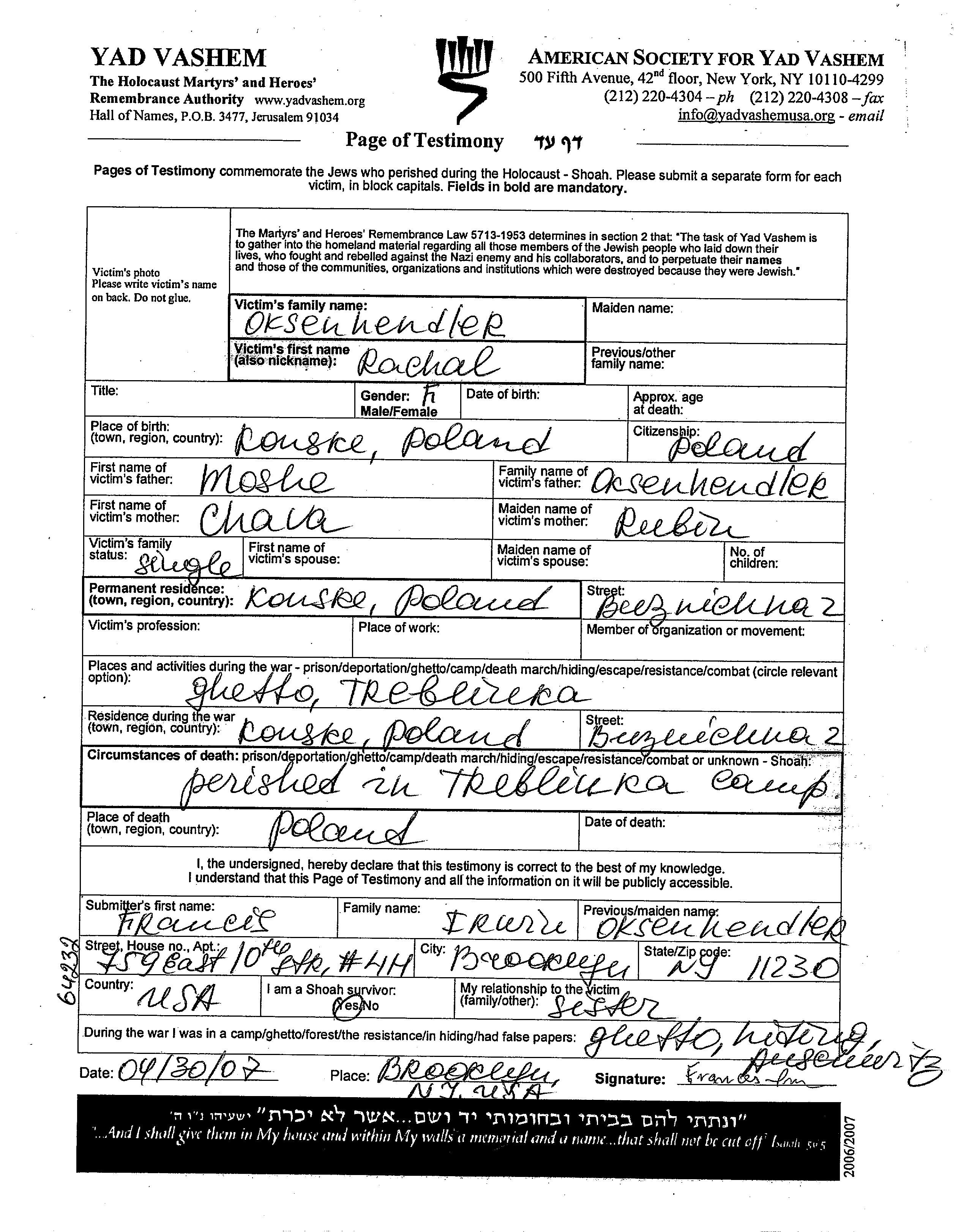 Rachal Oksenhendler wurde in Polen geboren. Sie war die Tochter von Moshe und Chava, geb. Rubin. Sie war Ledig. Vor dem Zweiten Weltkrieg lebte sie in Konskie, Polen. Während des Krieges war sie in Konskie, Polen.