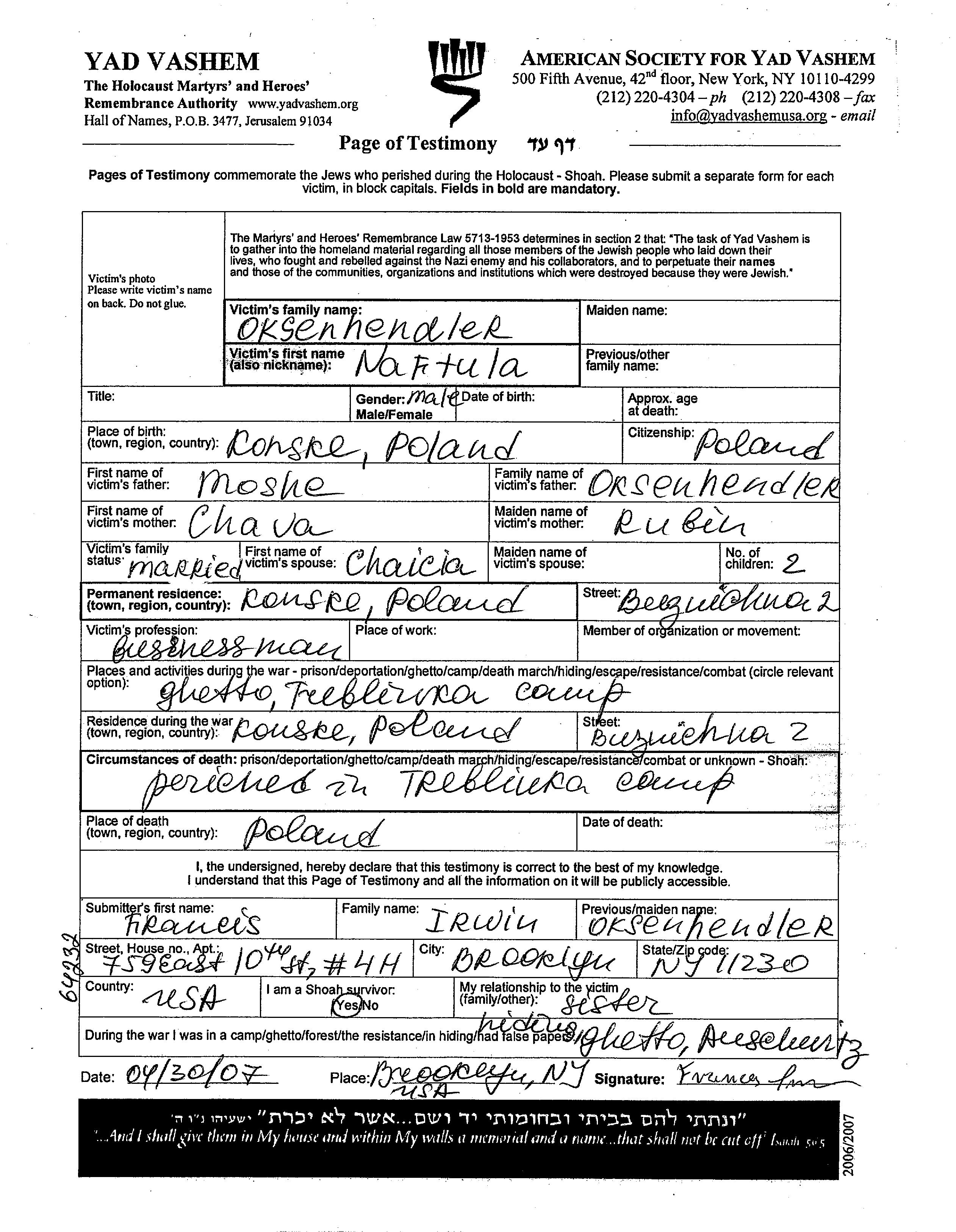Naftula Oksenhendler wurde in Konskie, Polen geboren. Er war der Sohn von Moshe und Chava, geb. Rubin. Er war Geschäftsmann und mit Chaicia Verheiratet. Vor dem Zweiten Weltkrieg lebte er in Konskie, Polen. Während des Krieges war er in Konskie, Polen.