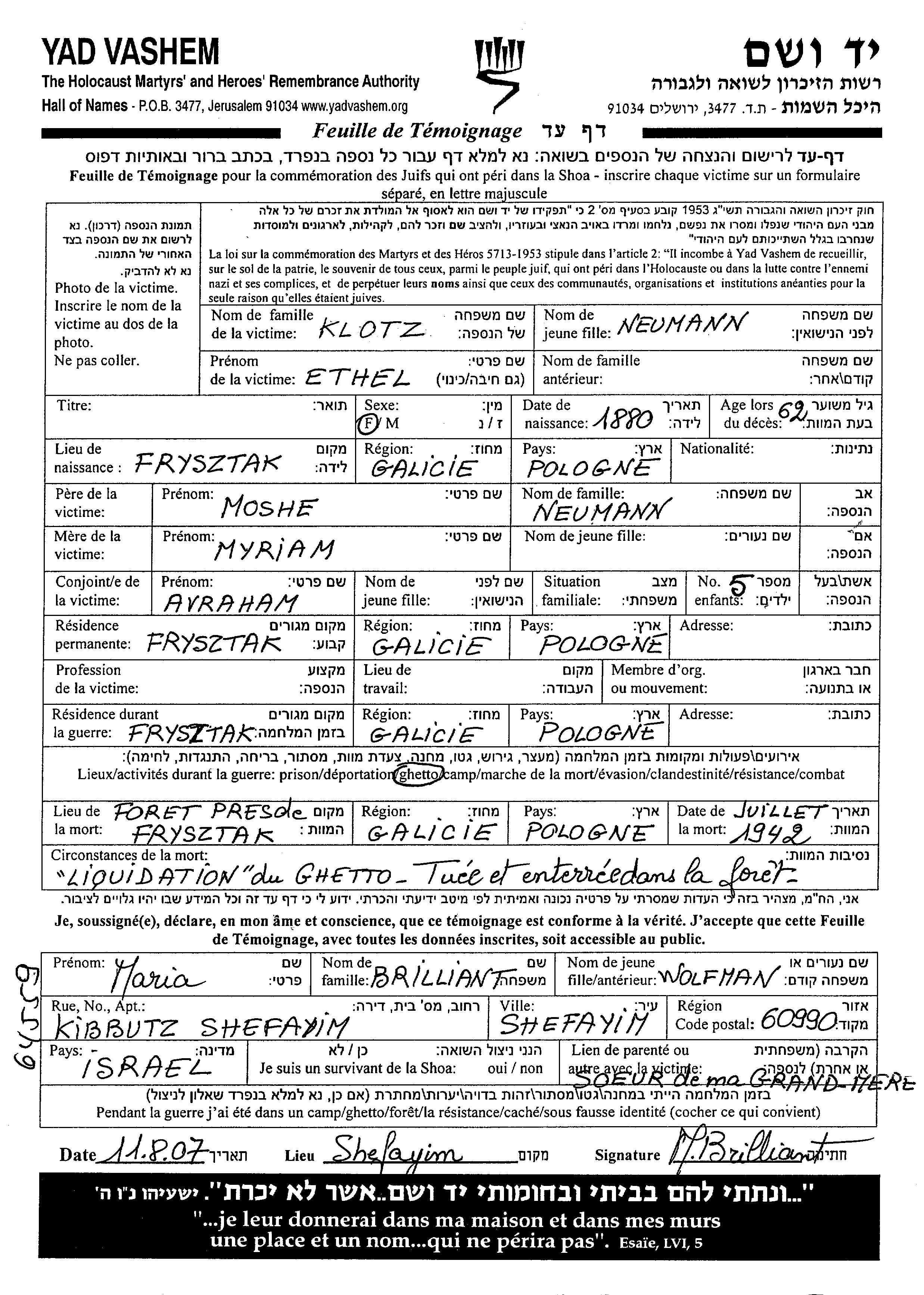 Ethel wurde in der Schoah ermordet. Todesort: Frysztak Forest, Polen im Jahr 07/1942.