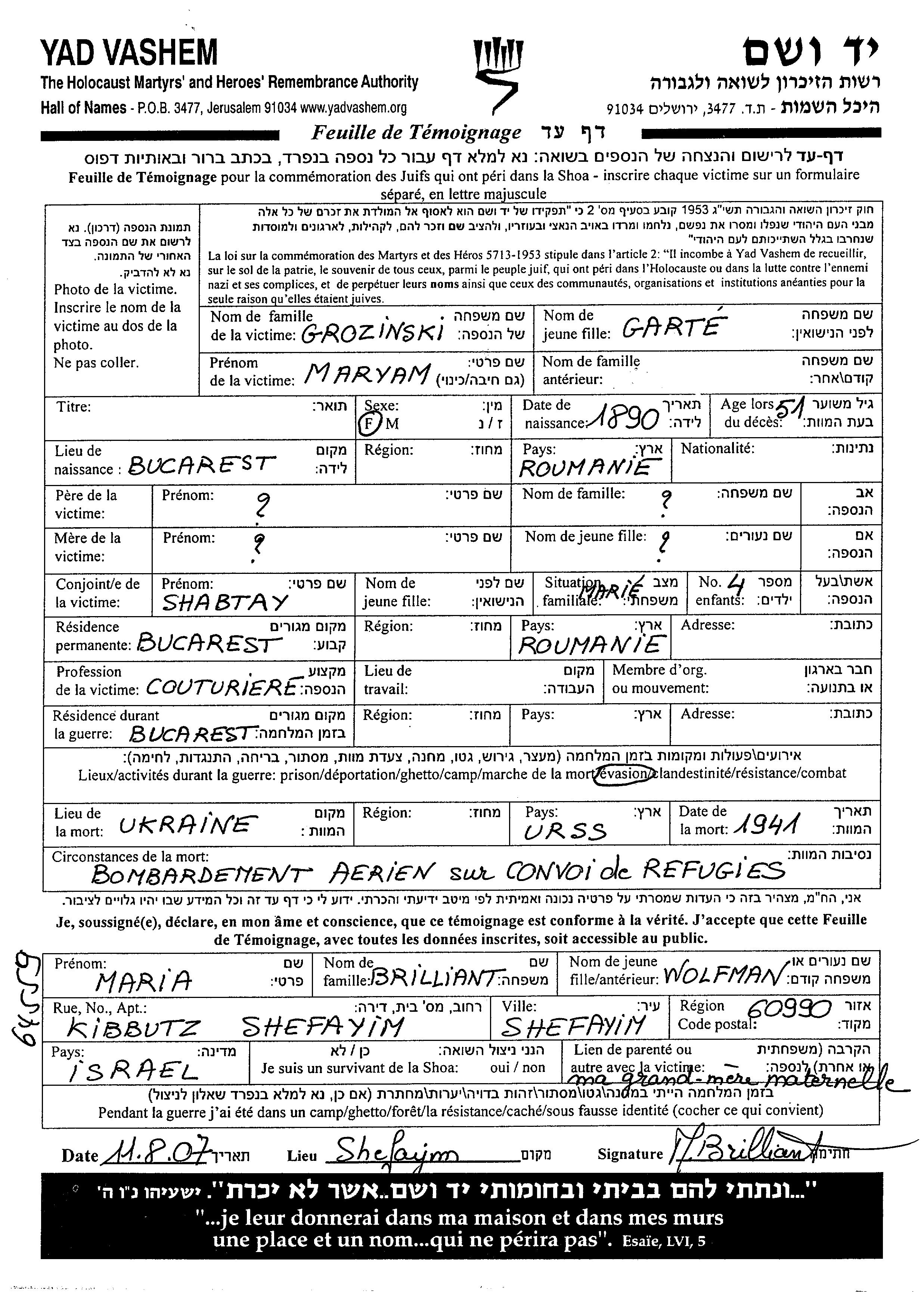 Maryam Grozinski, geb. Garte wurde im Jahr 1890 in Bucarest, Rumänien geboren. Sie war Schneiderin und mit Shabtay Verheiratet. Vor dem Zweiten Weltkrieg lebte sie in Bucarest, Rumänien. Während des Krieges war sie in Bucarest, Rumänien.