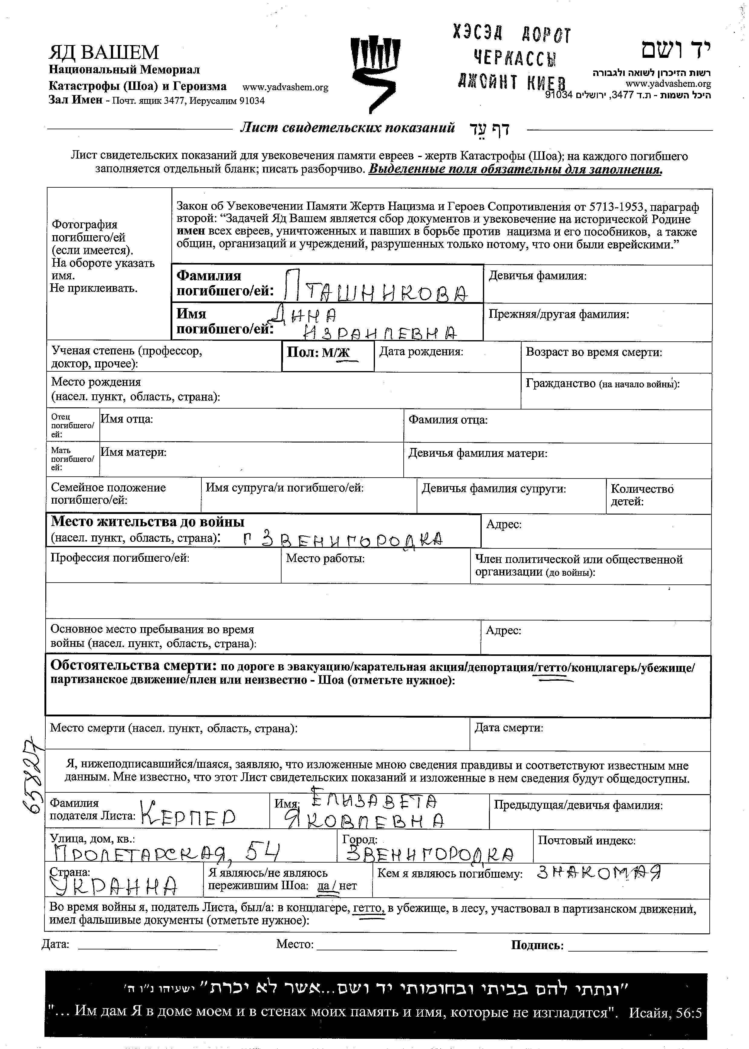 Anna Ptashnikova wurde Sie war die Tochter von Izrail. Vor dem Zweiten Weltkrieg lebte sie in Zvenigorodka, Ukraine (UdSSR). Während des Krieges war sie in Getto.
