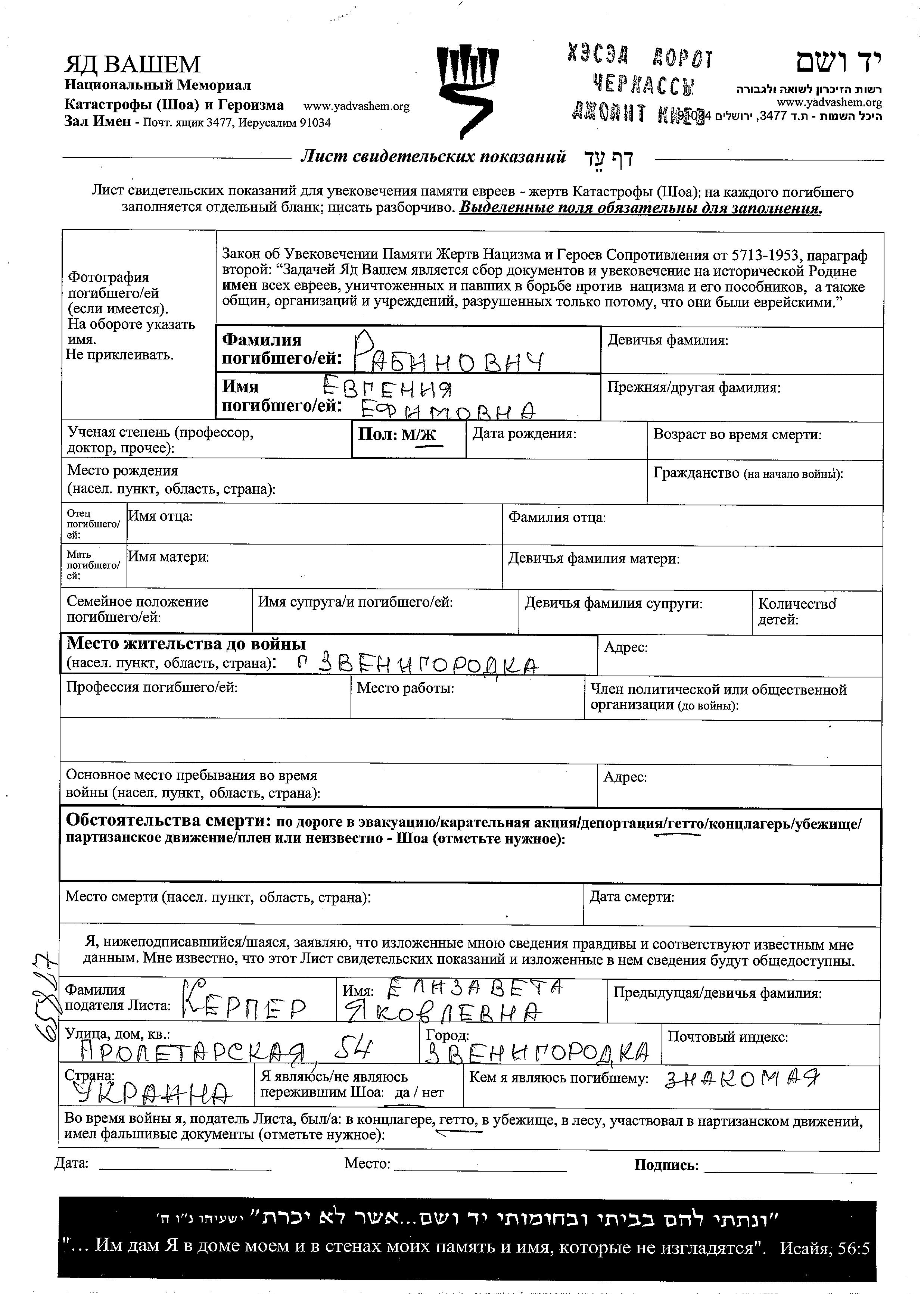 Yevgeniya wurde in der Schoah ermordet.
