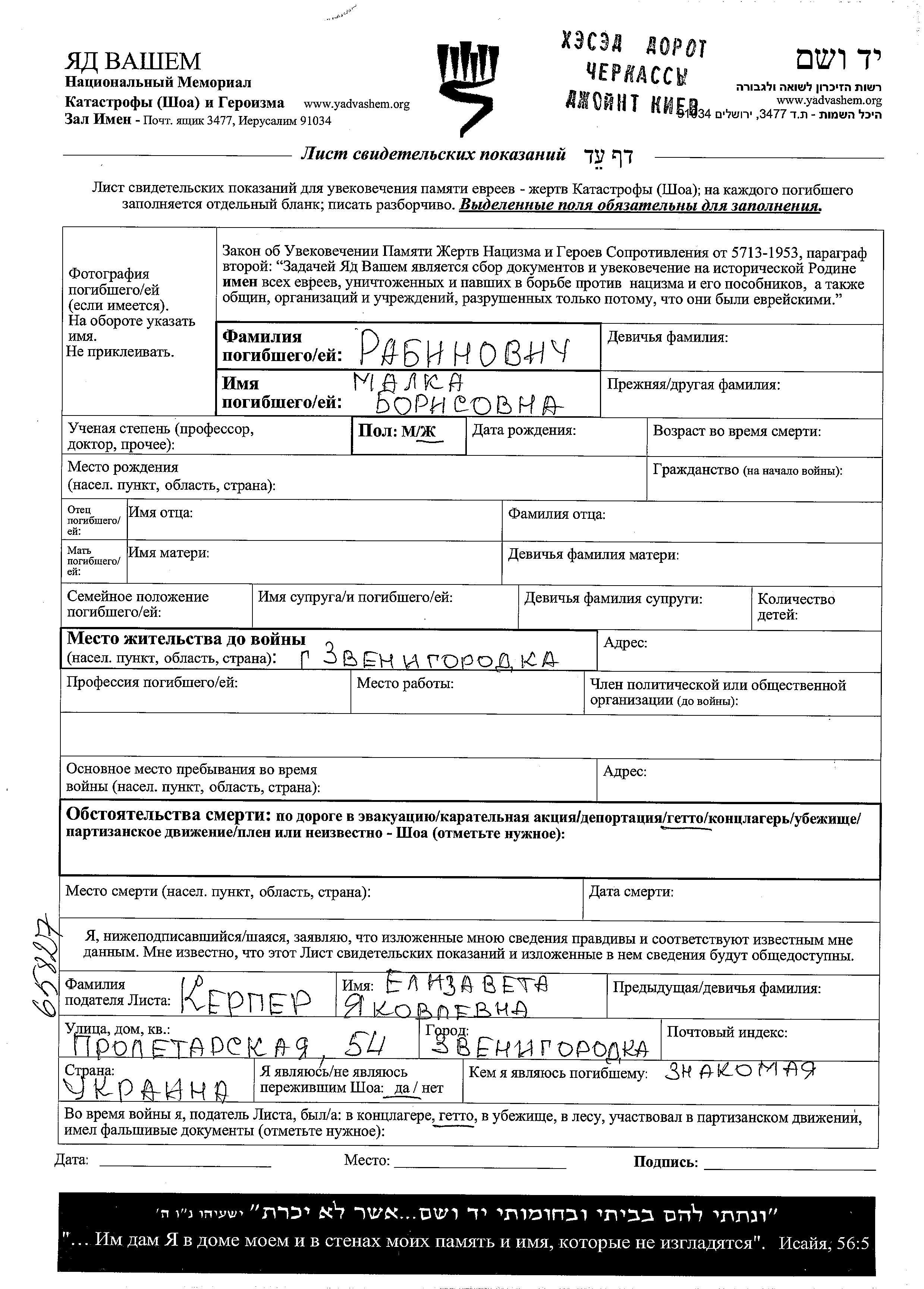 Malka wurde in der Schoah ermordet. Todesort: Zvenigorodka, Ukraine (UdSSR).