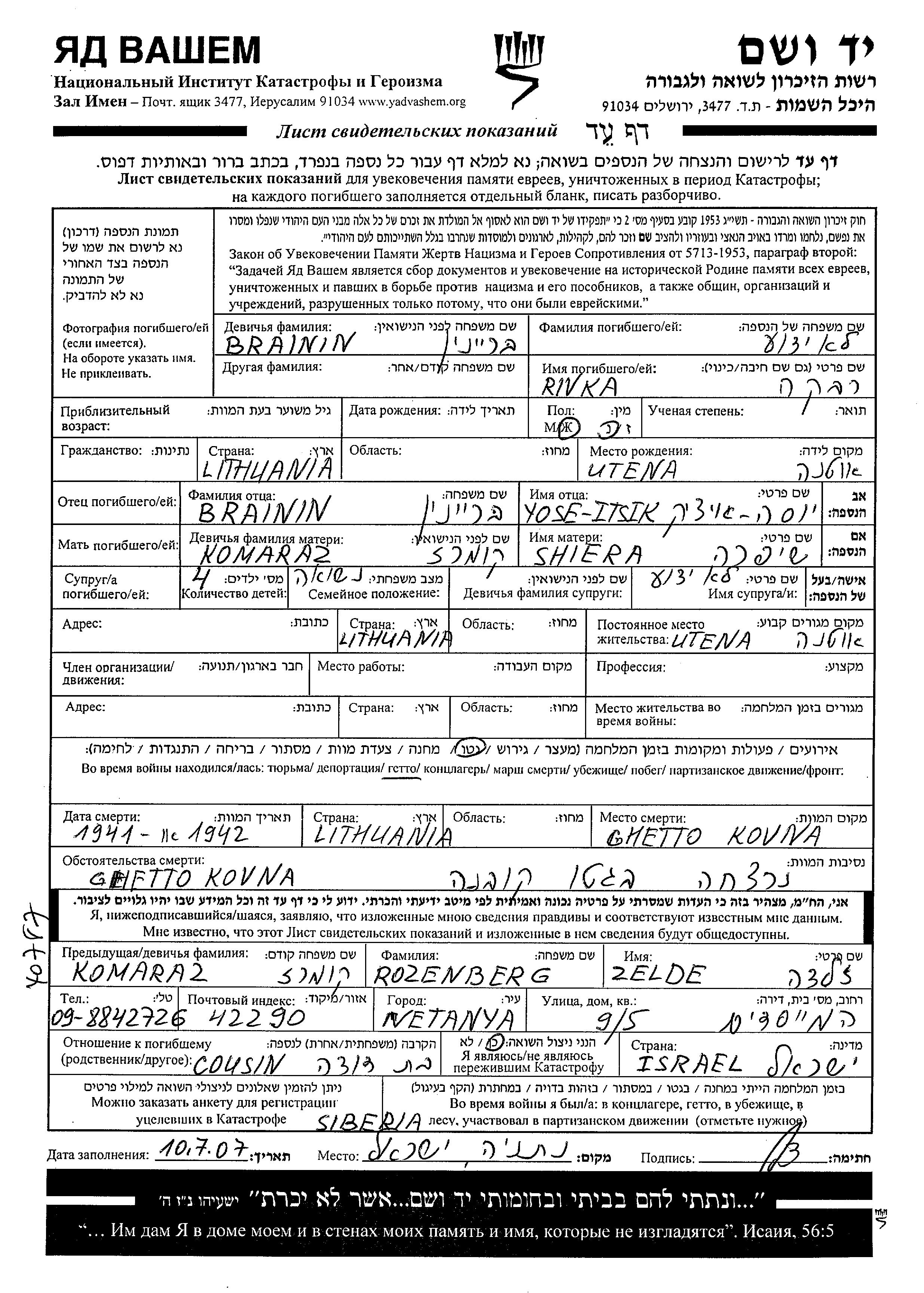 Rivka Name unbekannt, geb. Brainin wurde in Utena, Litauen geboren. Sie war die Tochter von Yose Itsik und Shifra, geb. Komaraz. Sie war Verheiratet. Vor dem Zweiten Weltkrieg lebte sie in Utena, Litauen. Während des Krieges war sie in Utena, Litauen.