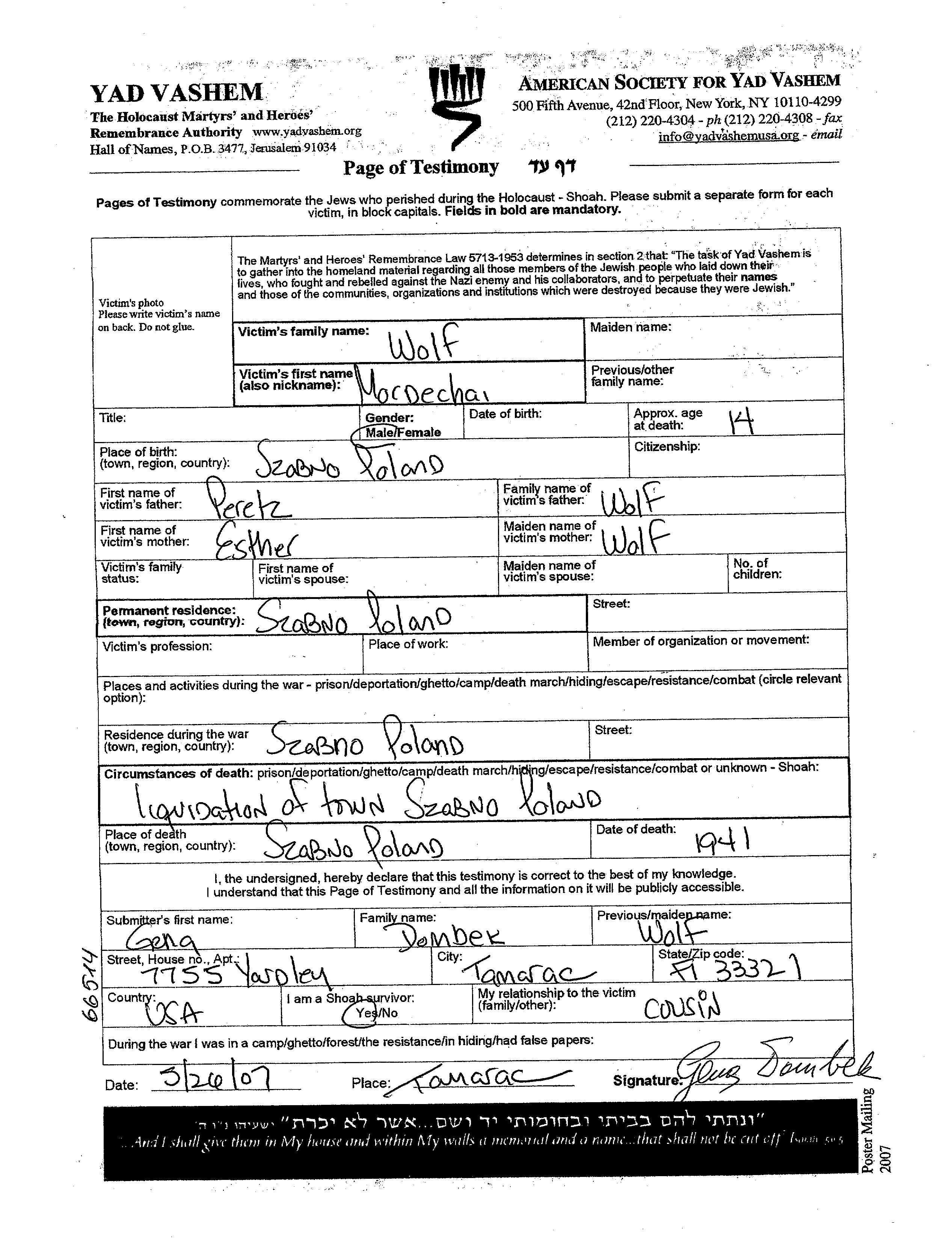 Mordechai Wolf wurde in Szewno, Polen geboren. Er war der Sohn von Peretz und Esther. Er war Jugendliche/-r. Vor dem Zweiten Weltkrieg lebte er in Szewno, Polen. Während des Krieges war er in Szewno, Polen.