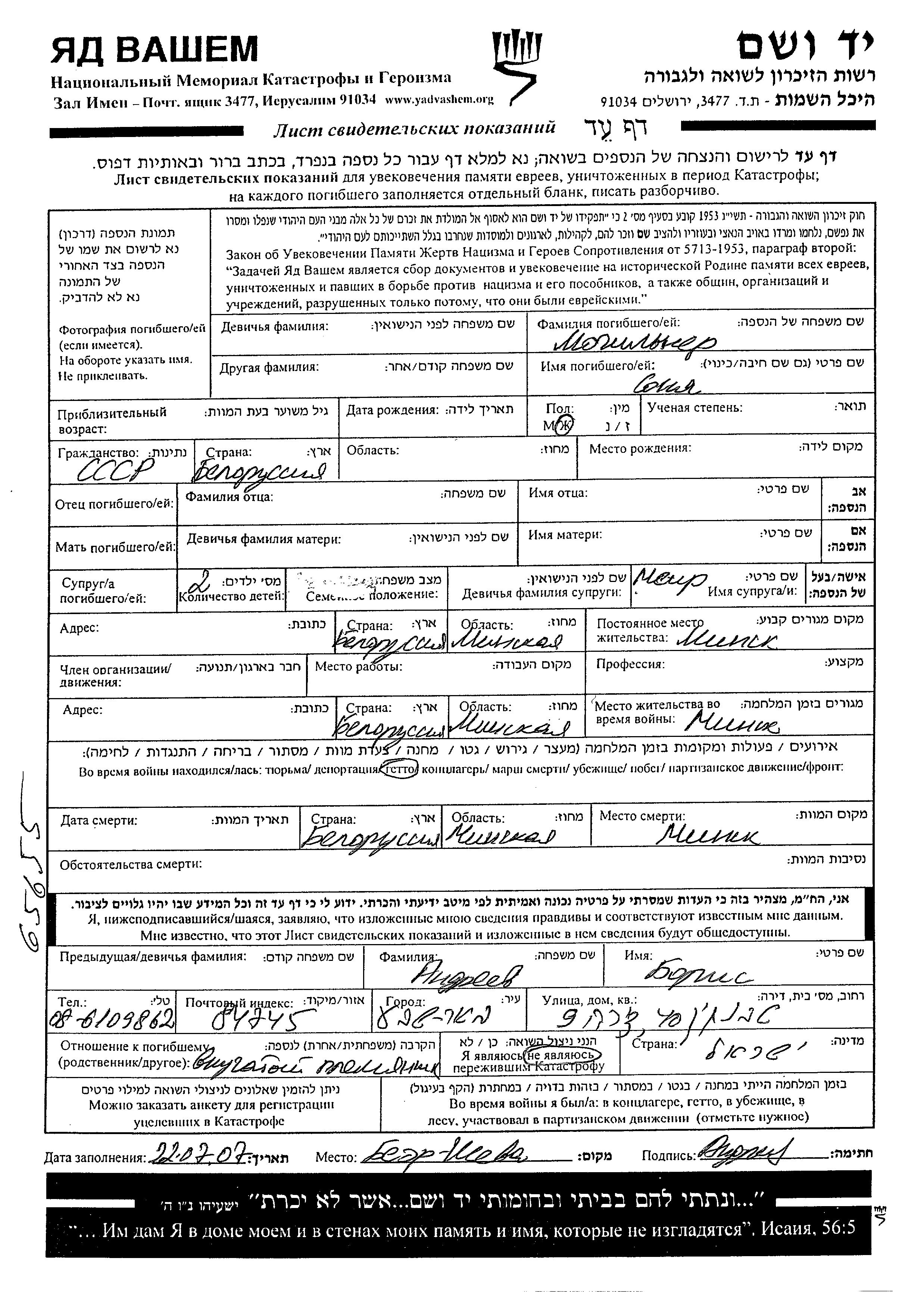 Sonya Mogilner wurde in Weißrussland (UdSSR) geboren. Sie war Verheiratet. Vor dem Zweiten Weltkrieg lebte sie in Minsk, Weißrussland (UdSSR). Während des Krieges war sie in Minsk, Weißrussland (UdSSR).