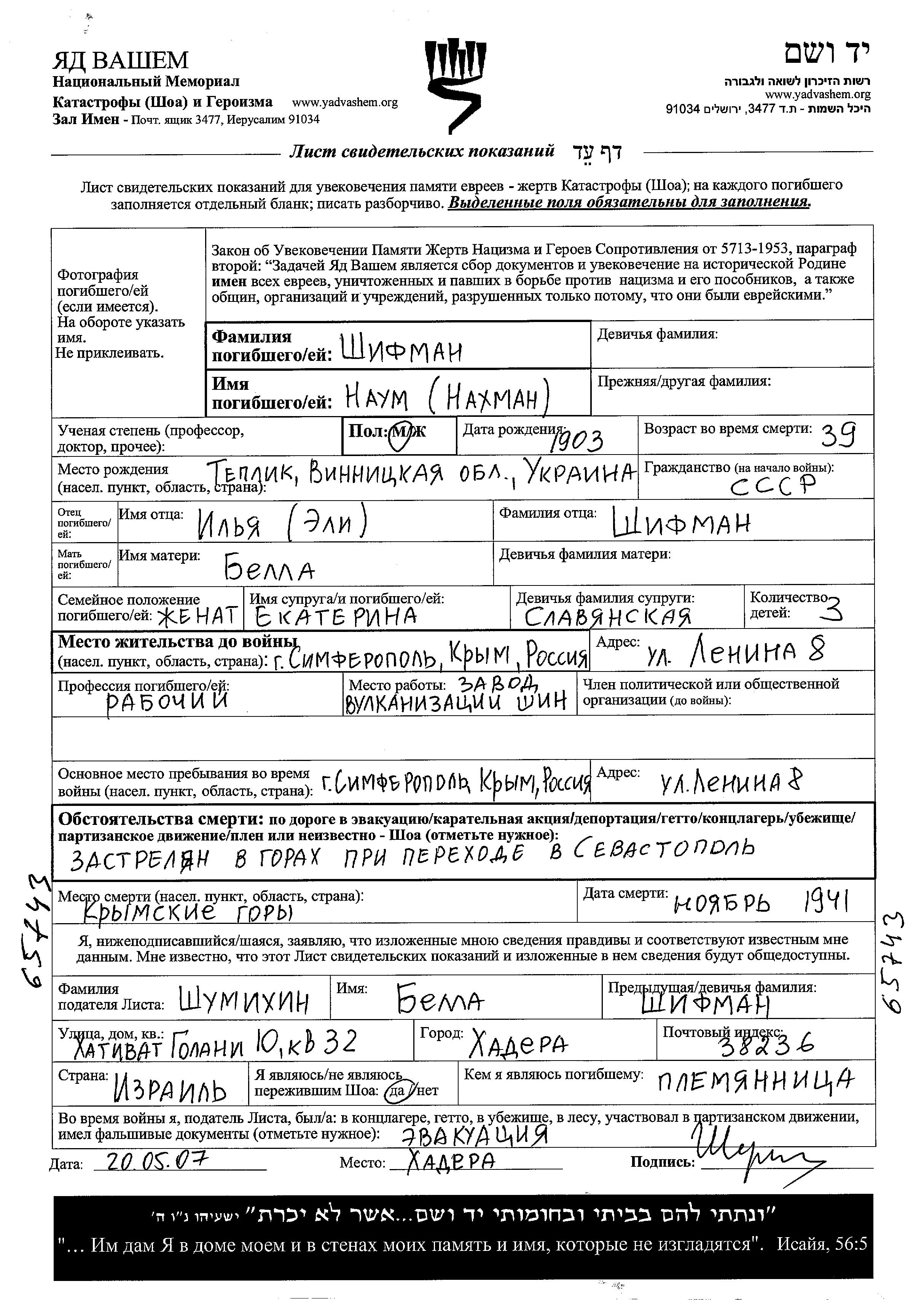 Naum Nakhman Shifman wurde im Jahr 1903 in Teplik, Ukraine (UdSSR) geboren. Er war der Sohn von Ilya Eli und Bella. Er war Arbeiter/-in und mit Yekaterina, geb. Slavyanskaya Verheiratet. Vor dem Zweiten Weltkrieg lebte er in Simferopol, Russland (UdSSR). Während des Krieges war er in Simferopol, Russland (UdSSR).