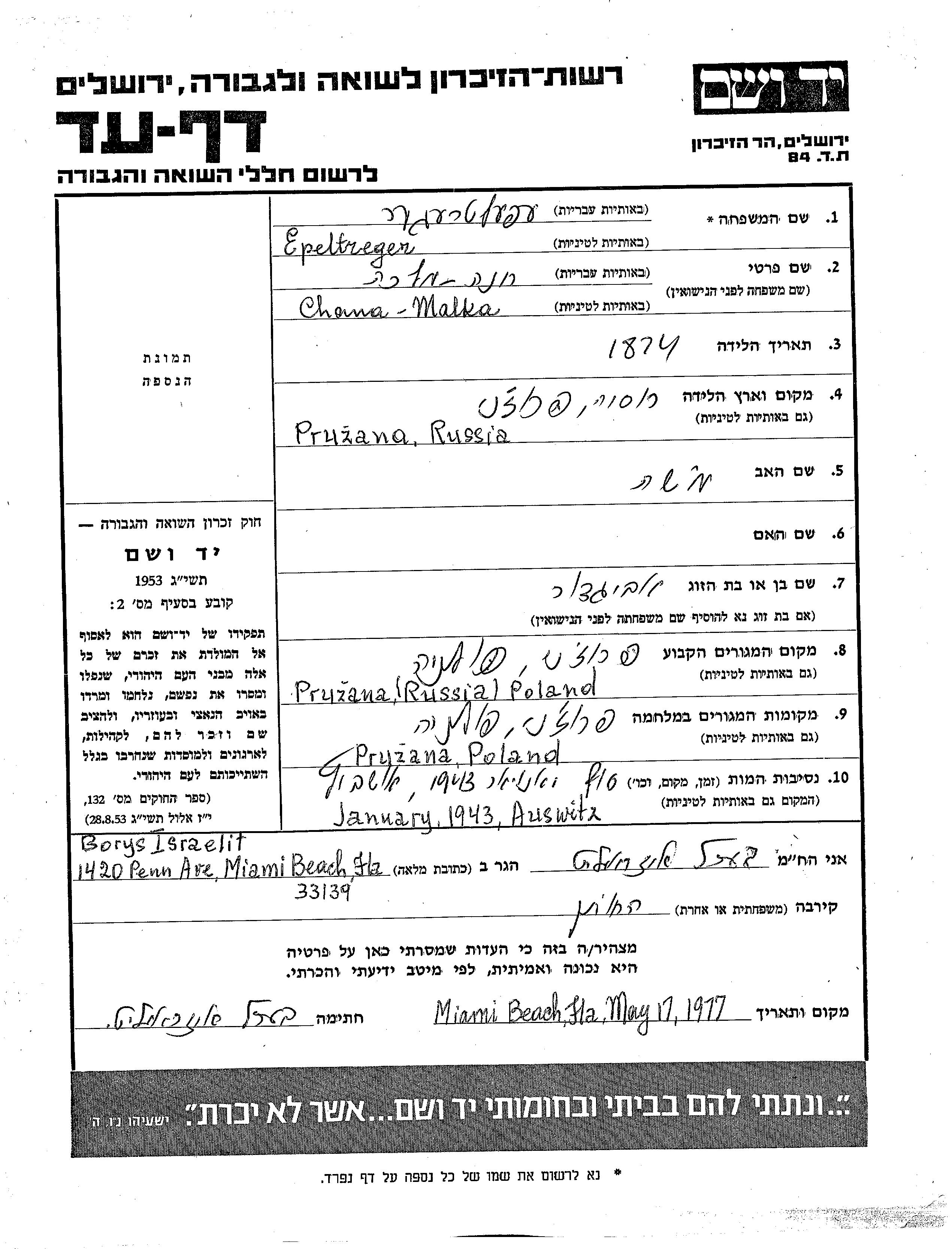 Chana Malka Epeltreger wurde im Jahr 1874 in Pruzana, Polen geboren. Sie war die Tochter von Moshe. Sie war mit Avigdor Verheiratet. Vor dem Zweiten Weltkrieg lebte sie in Pruzana, Polen. Während des Krieges war sie in Pruzana, Polen.