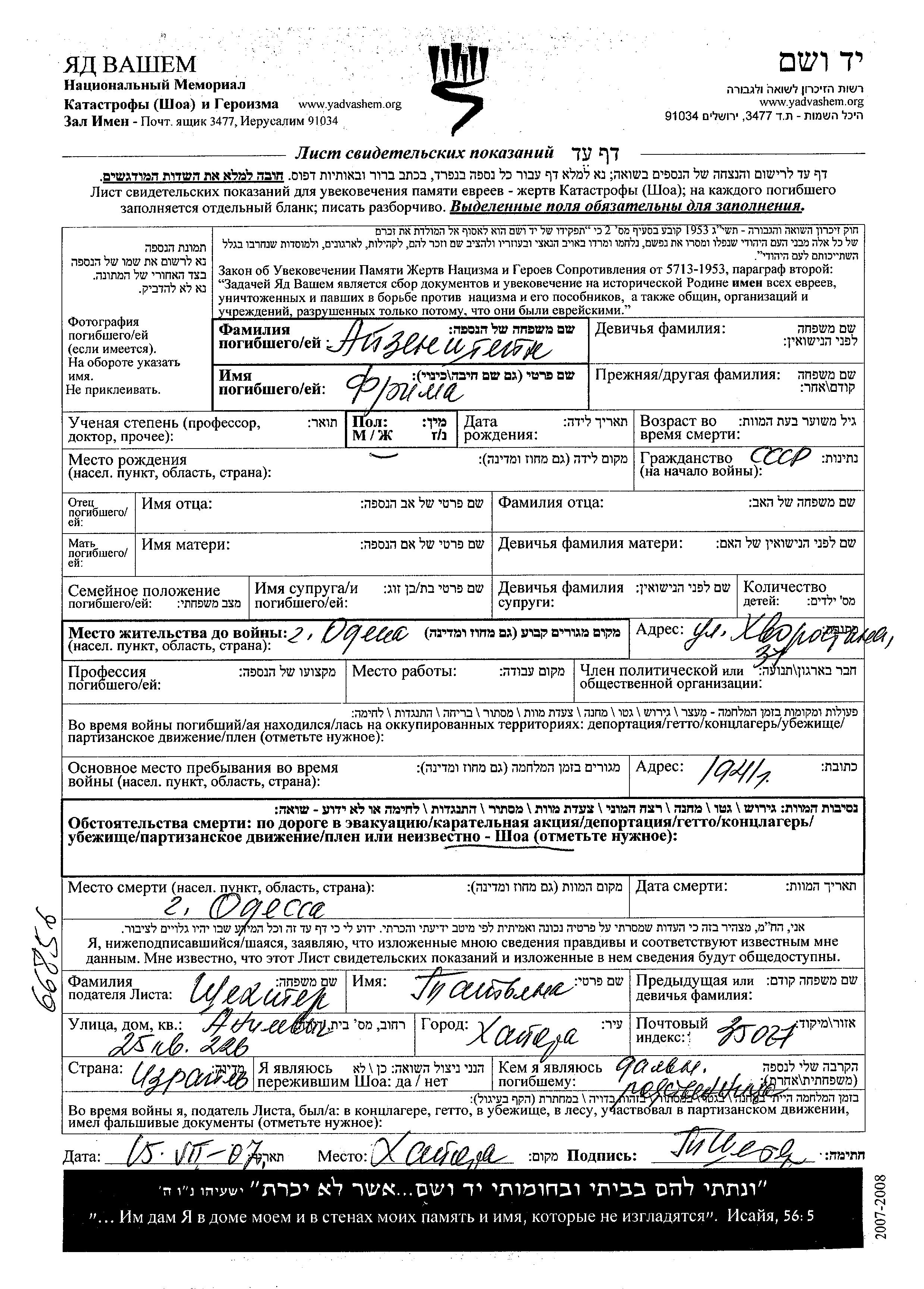Suche nach einem Todesjahr im Zeitraum der Holocaust: 1933 bis 1945. Bitte wählen Sie 'Exakt' im Auswahlmenü, um nur nach einem einzelnen Jahr zu suchen, alternativ können Sie die flexibleren Optionen '+/- 2 Jahre' oder '+/- 5 Jahre' wählen.