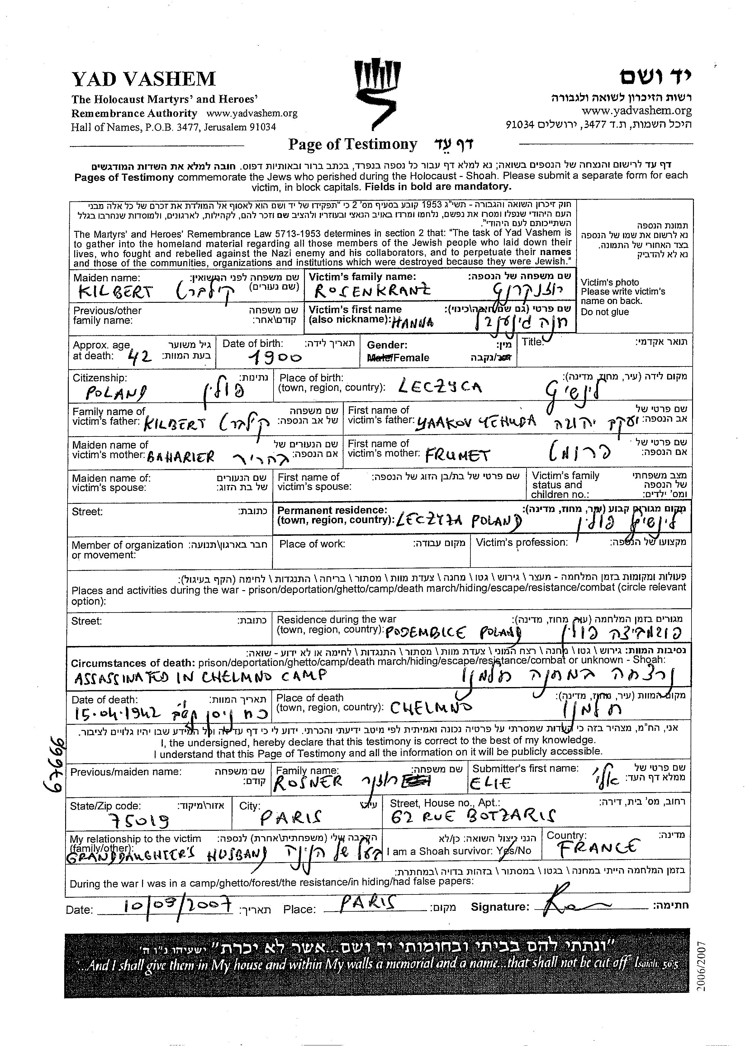 Hanna Ginendl Rosenkranz, geb. Kilbert wurde im Jahr 1900 in Leczyca, Polen geboren. Sie war die Tochter von Yaakov Yehuda und Frumet, geb. Baharier. Vor dem Zweiten Weltkrieg lebte sie in Leczyca, Polen. Während des Krieges war sie in Podembice, Polen.