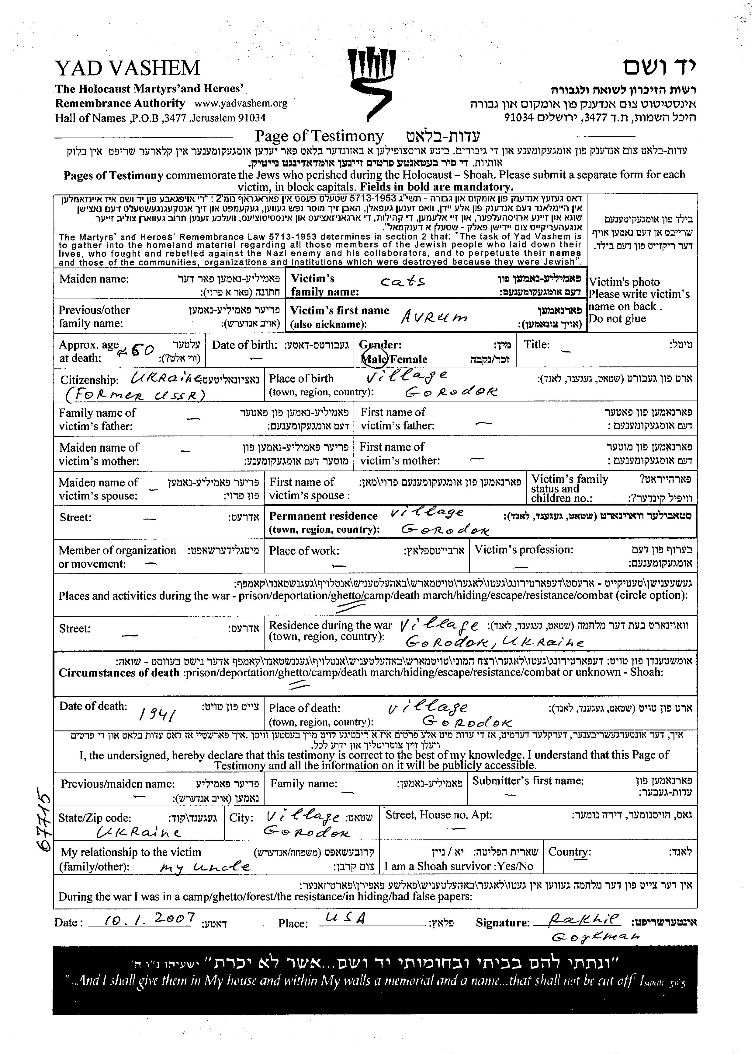 Katz Avrum Gorodok, Ukraine (UdSSR) Gedenkblatt