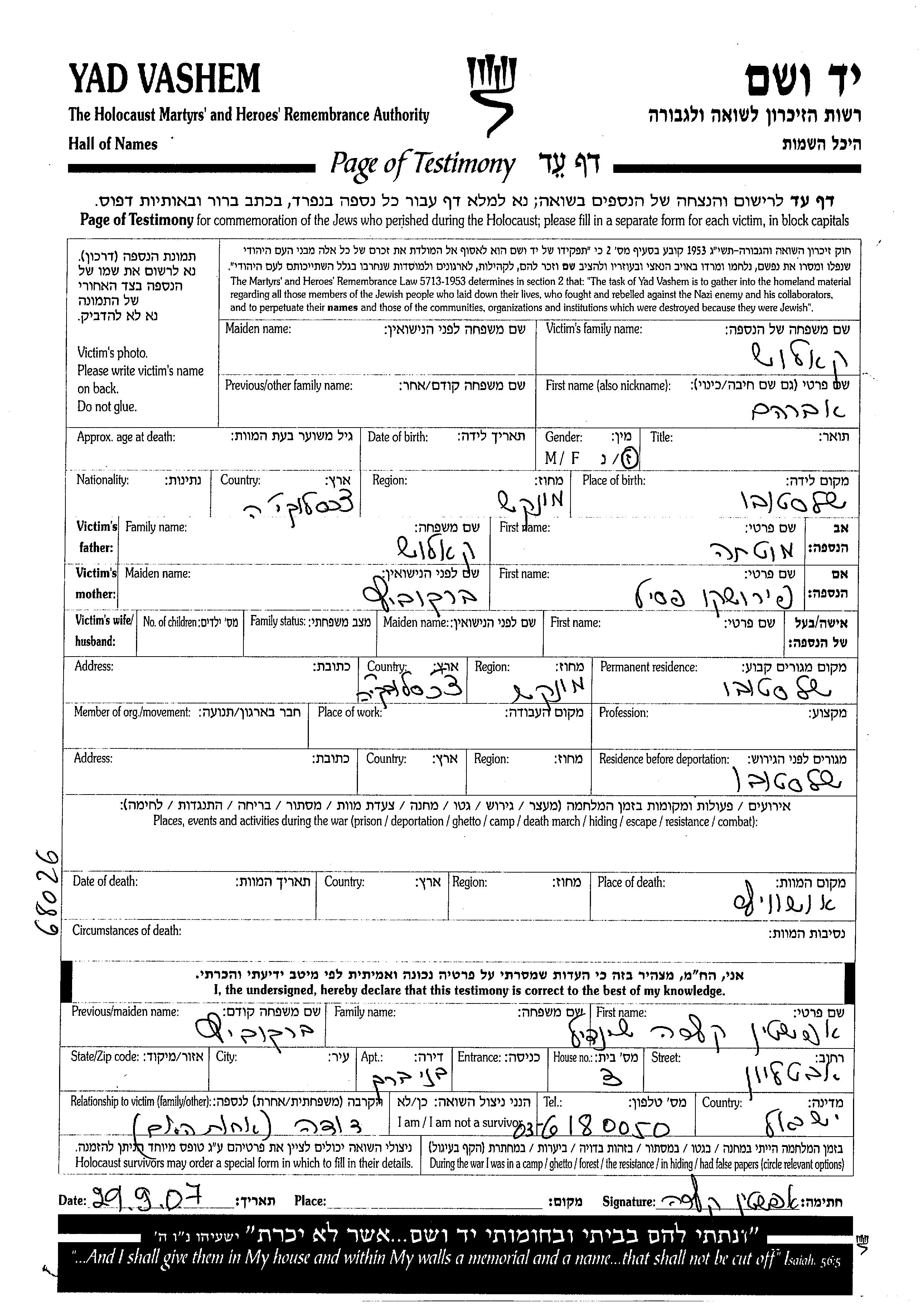Avraham wurde in der Schoah ermordet. Todesort: Auschwitz, Polen.